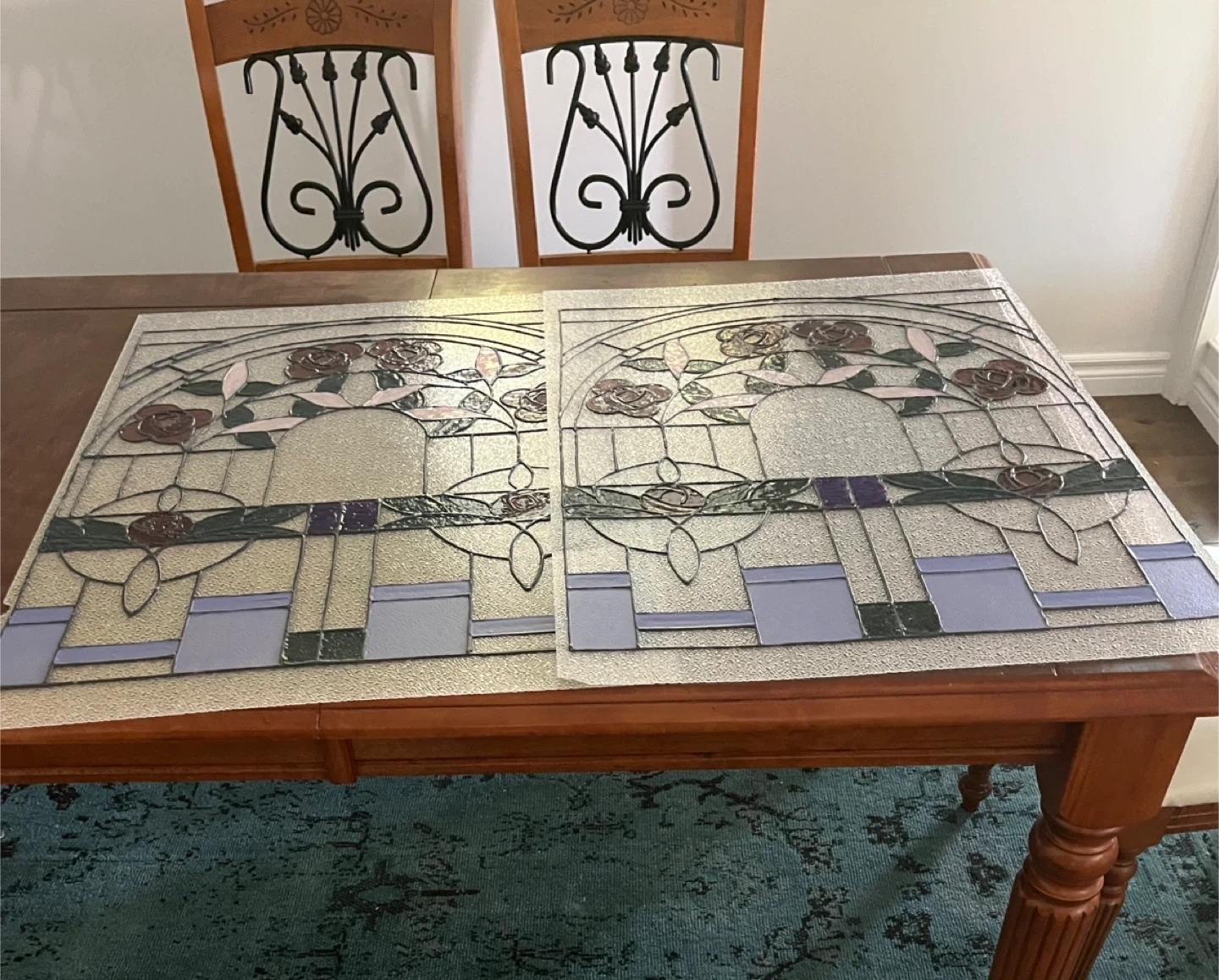 30Selling a stained plastic window panel. It has a beautiful floral design with purple and green accents. There's a small crack on the edge of one of the panels, as shown in the photos. Both $15 or $10 each