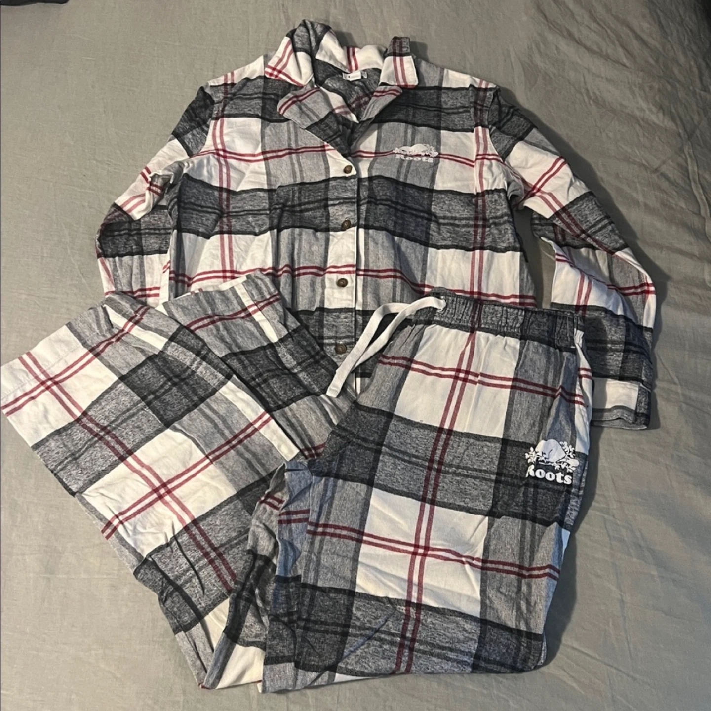 Iconic roots plaid print. Great condition, barely worn. 100% cotton. Pants have lots of pockets. Inseam on pants is about 29". Currently on the site for $118. Both pieces are medium