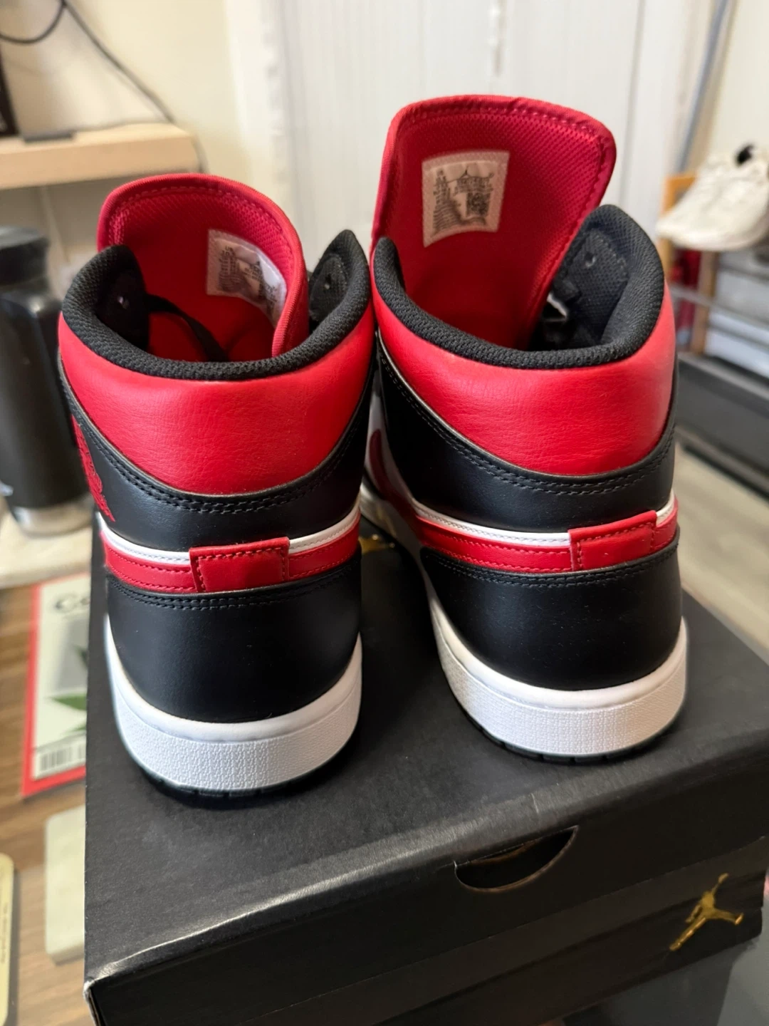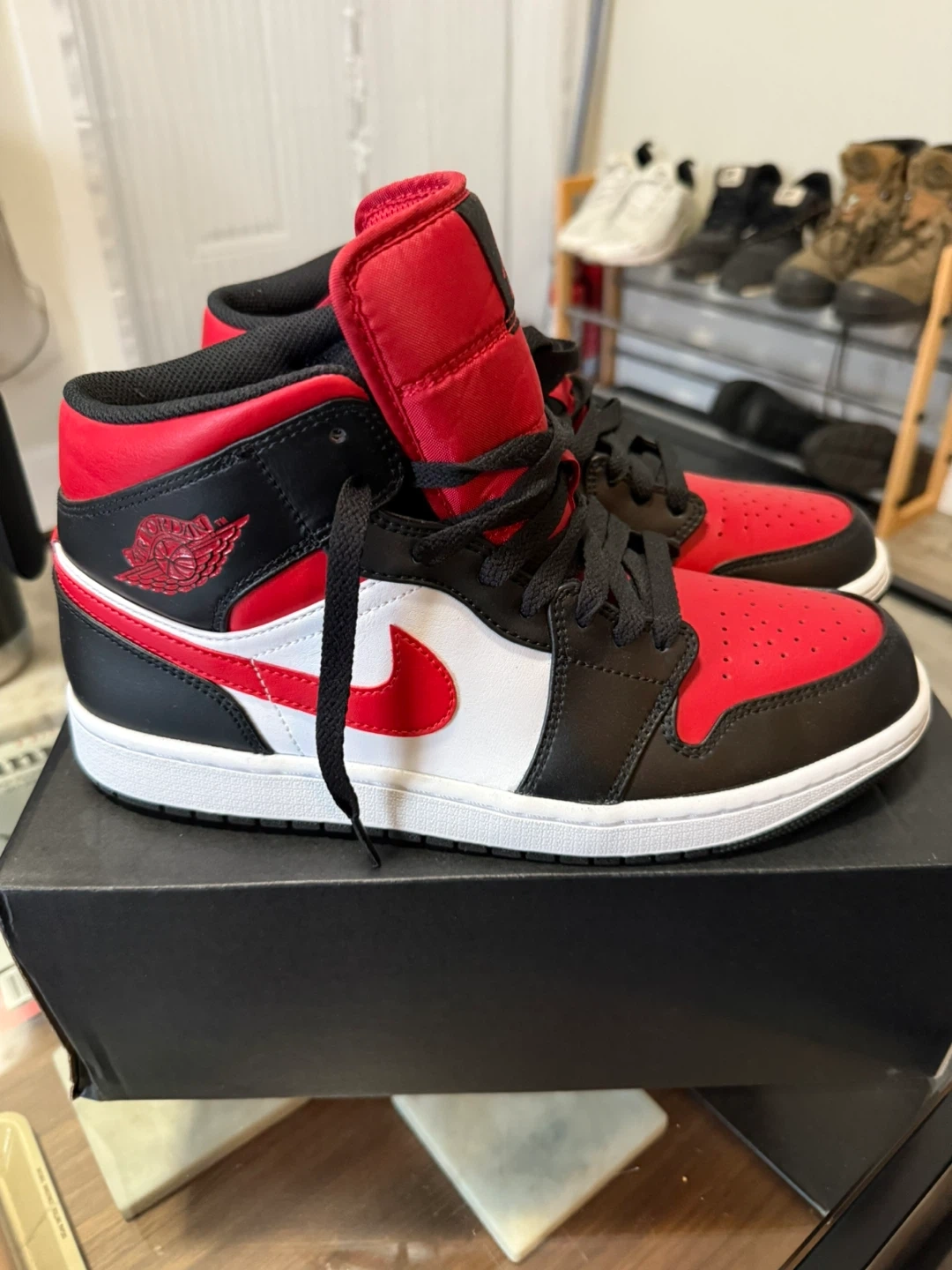 Selling a pair of Air Jordan 1 Mid SE shoes in black and red. They are in great condition and come with the original box. The size is US 10.5. A stylish addition to any sneaker collection!
