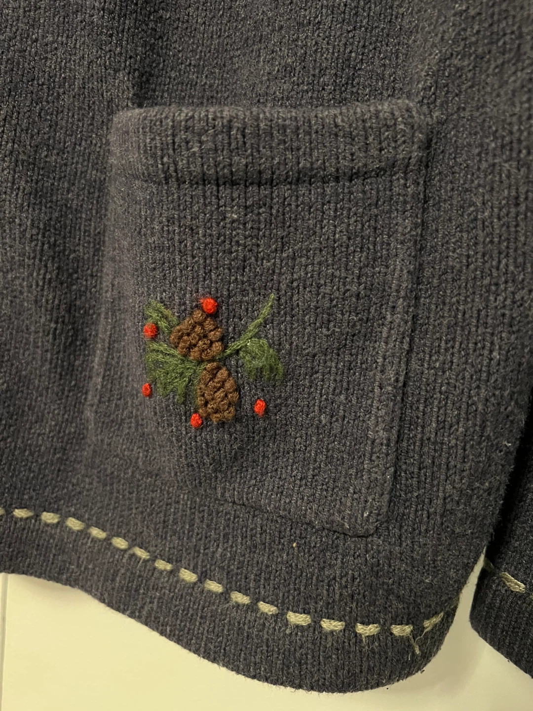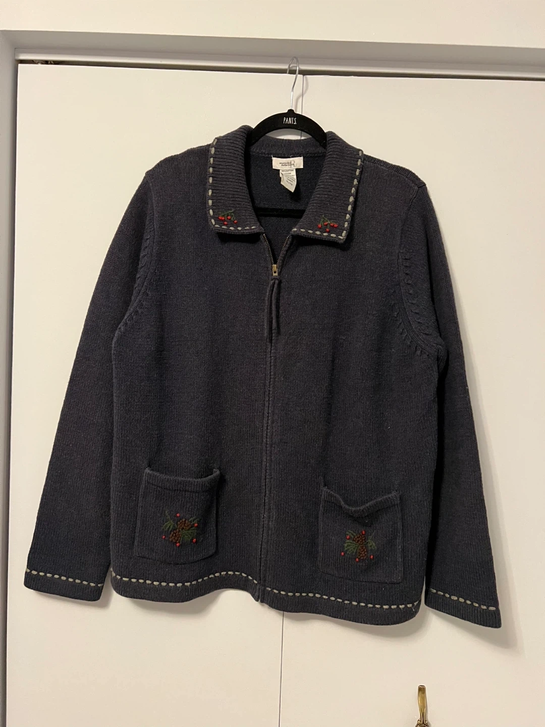 Stylish yet cozy navy knit cardigan with a zip-up front. Perfect for layering.