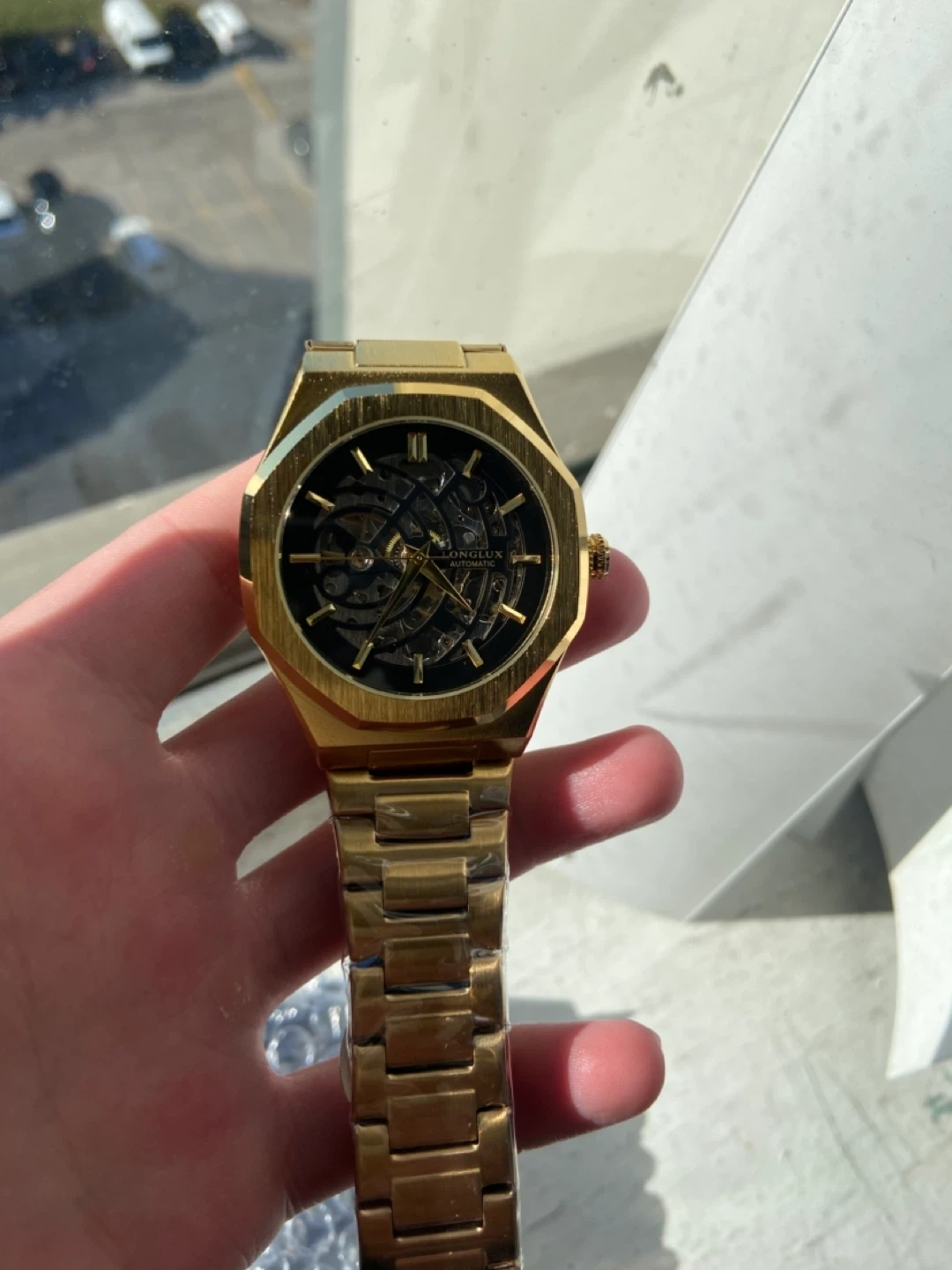 21Selling a LONGLUX automatic skeleton watch in gold. It's in great condition and comes with the original box. A stylish timepiece for any occasion!