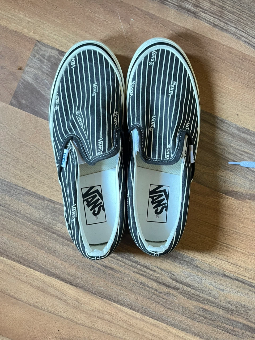 Selling a pair of Vans Style 98 slip-on shoes in a unique black and white striped design! They're in great condition and are a size 7