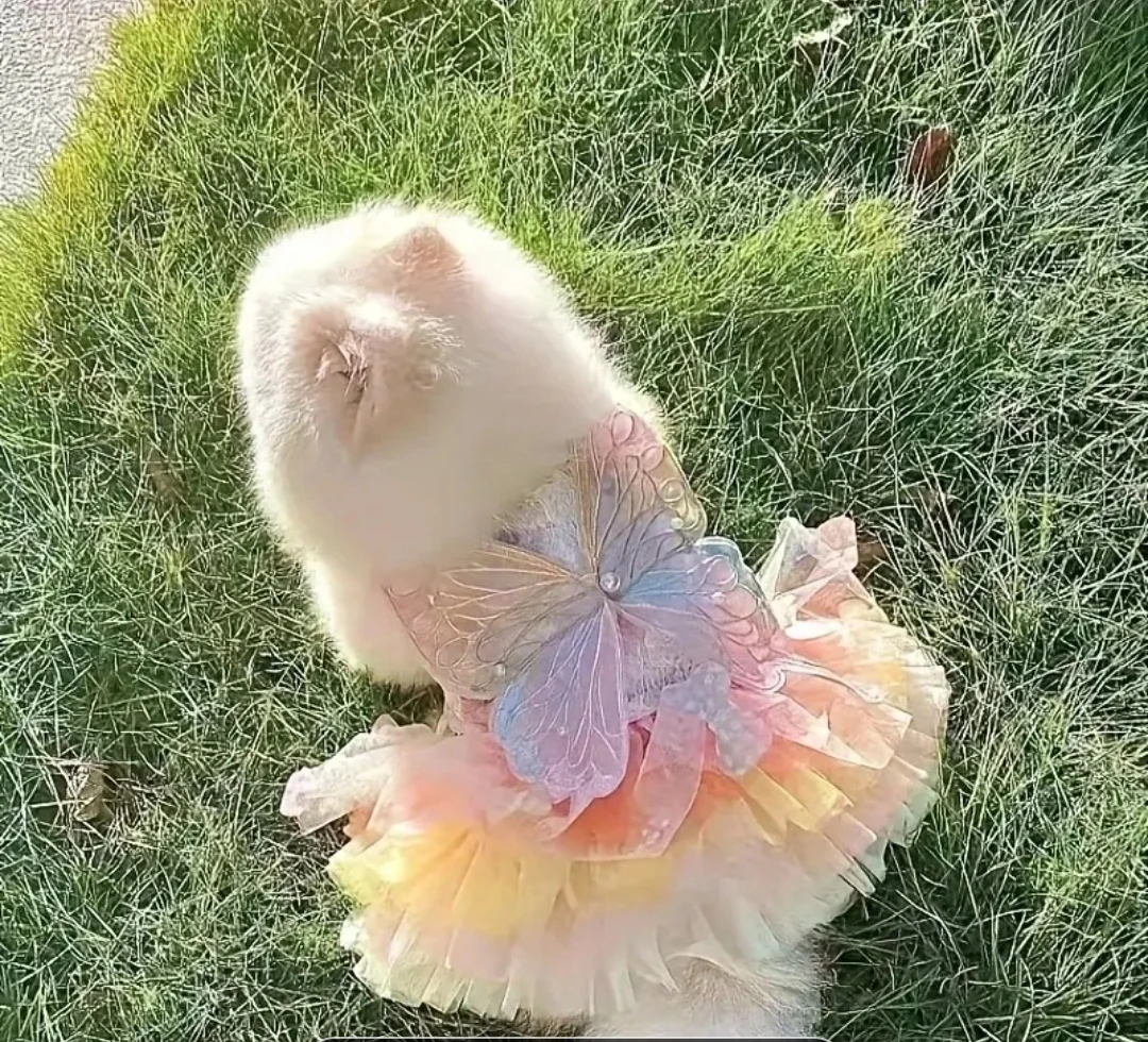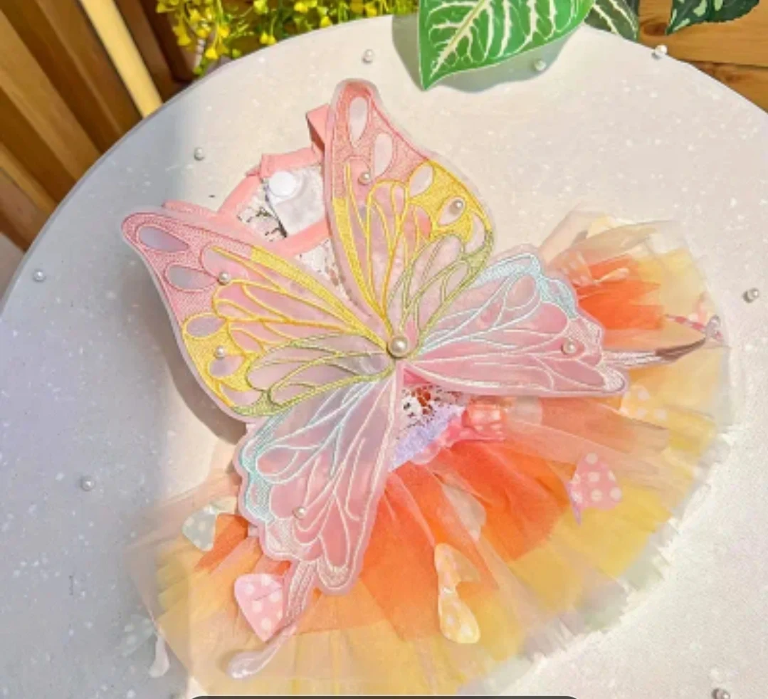 This adorable butterfly dog dress is perfect for your furry friend! It's a size medium, according to the size chart in the photos. Your dog will look so cute wearing this!