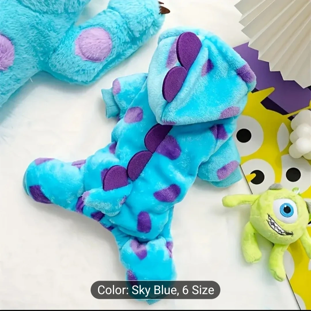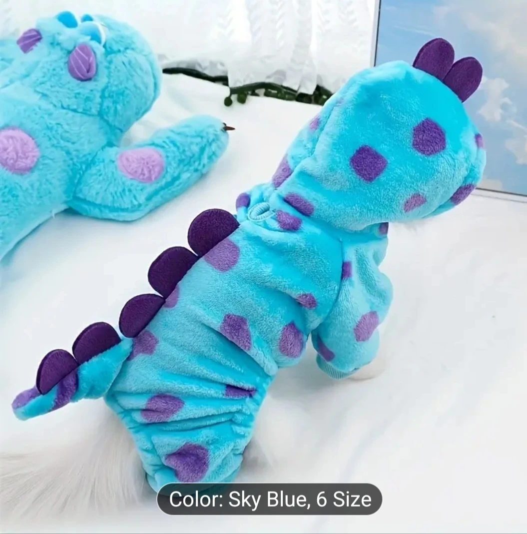 Super cute sky blue monster dog costume, perfect for keeping your furry friend warm and stylish! It's a size 6 and features a fun monster design with purple spots and a tail. Your dog will be the talk of the town!