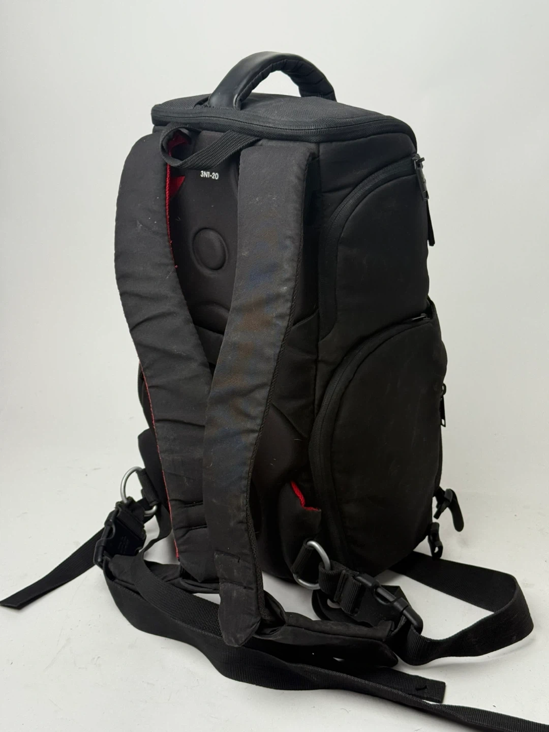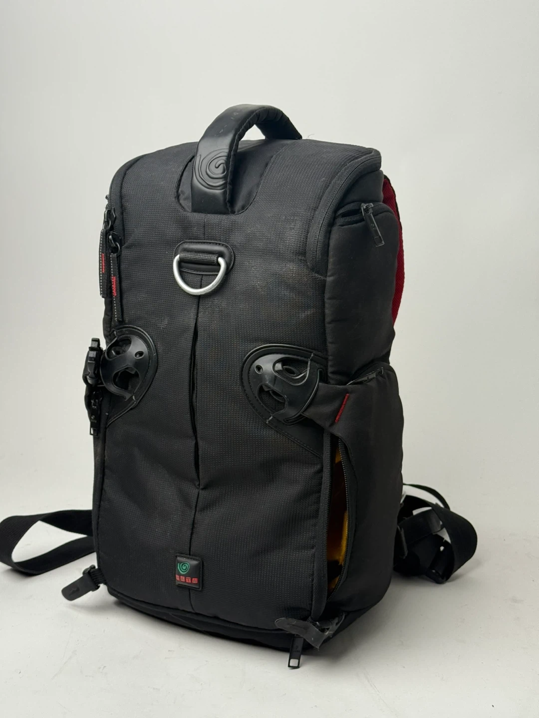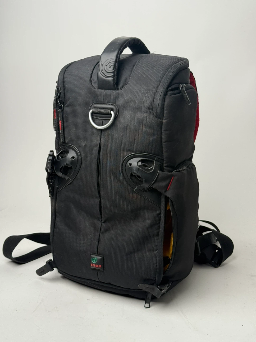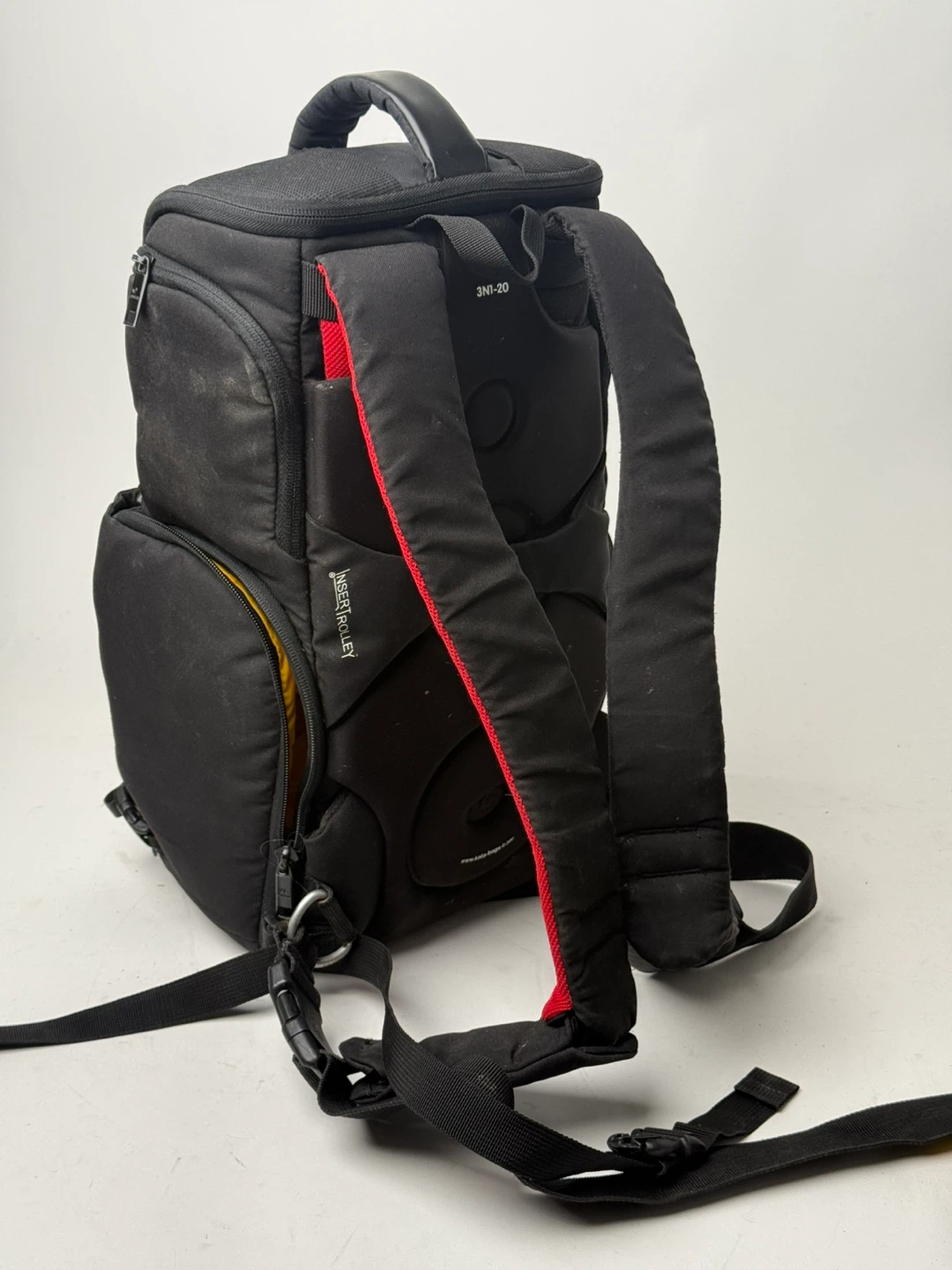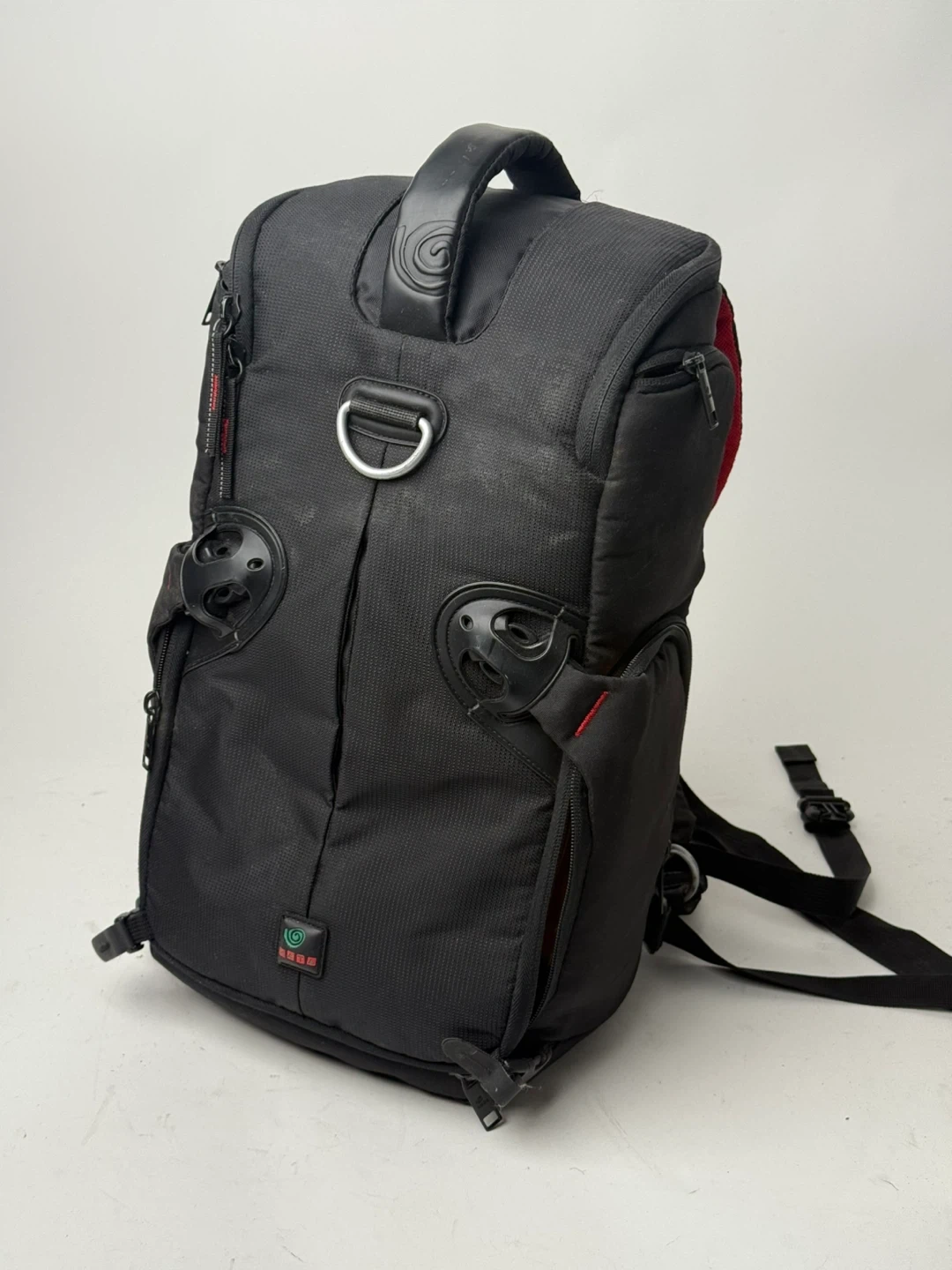 This versatile Kata 3N1-20 camera backpack is designed for photographers on the go, offering multiple carrying configurations to suit different shooting scenarios. The bag features ample storage space for a DSLR camera, lenses, and accessories, with protective padding to keep your equipment safe and secure. This item is in used condition.