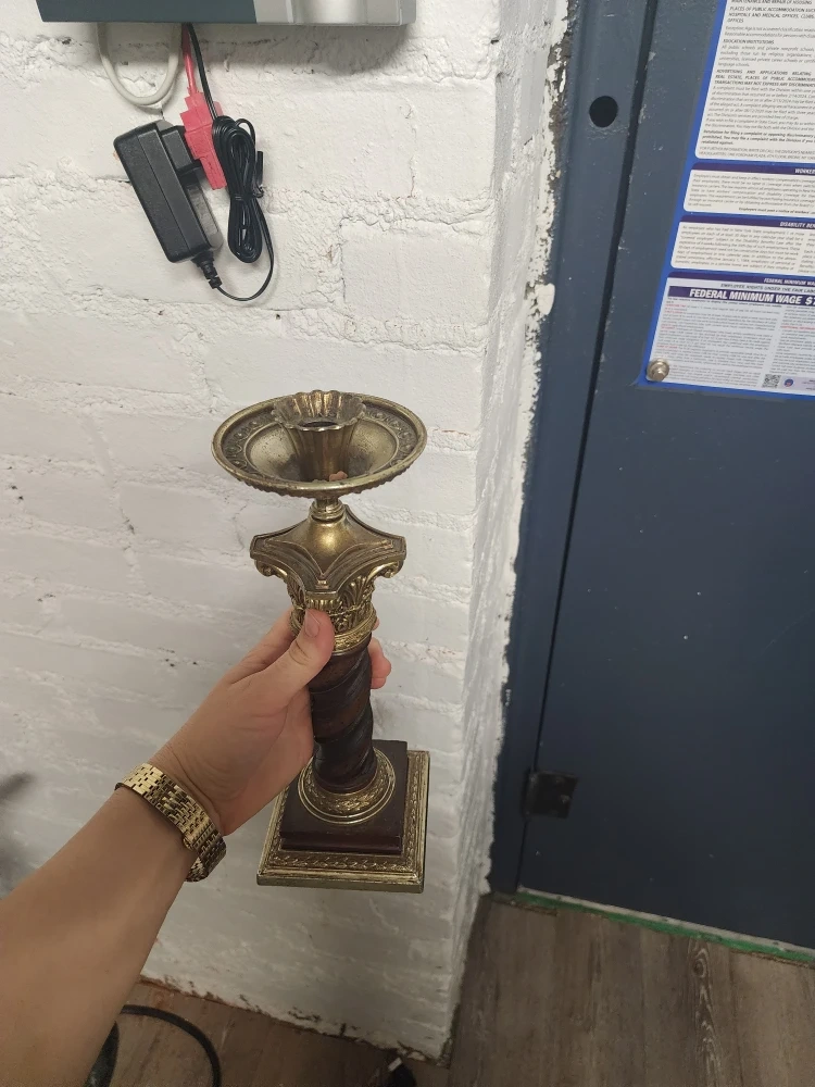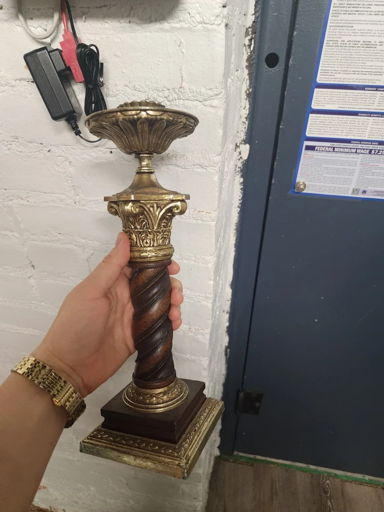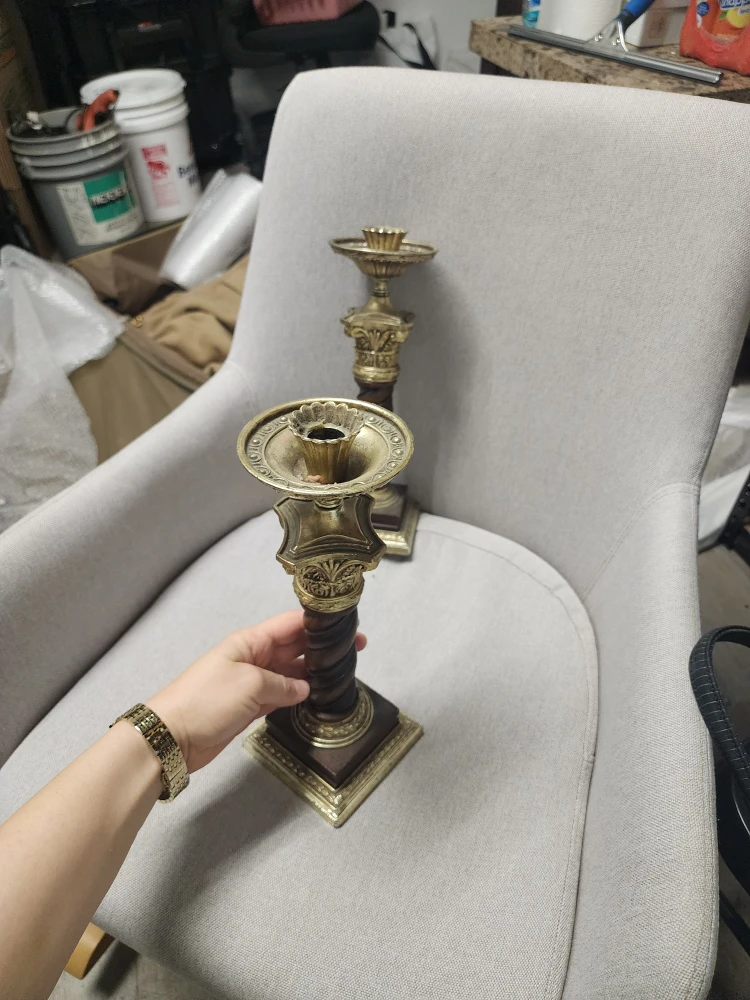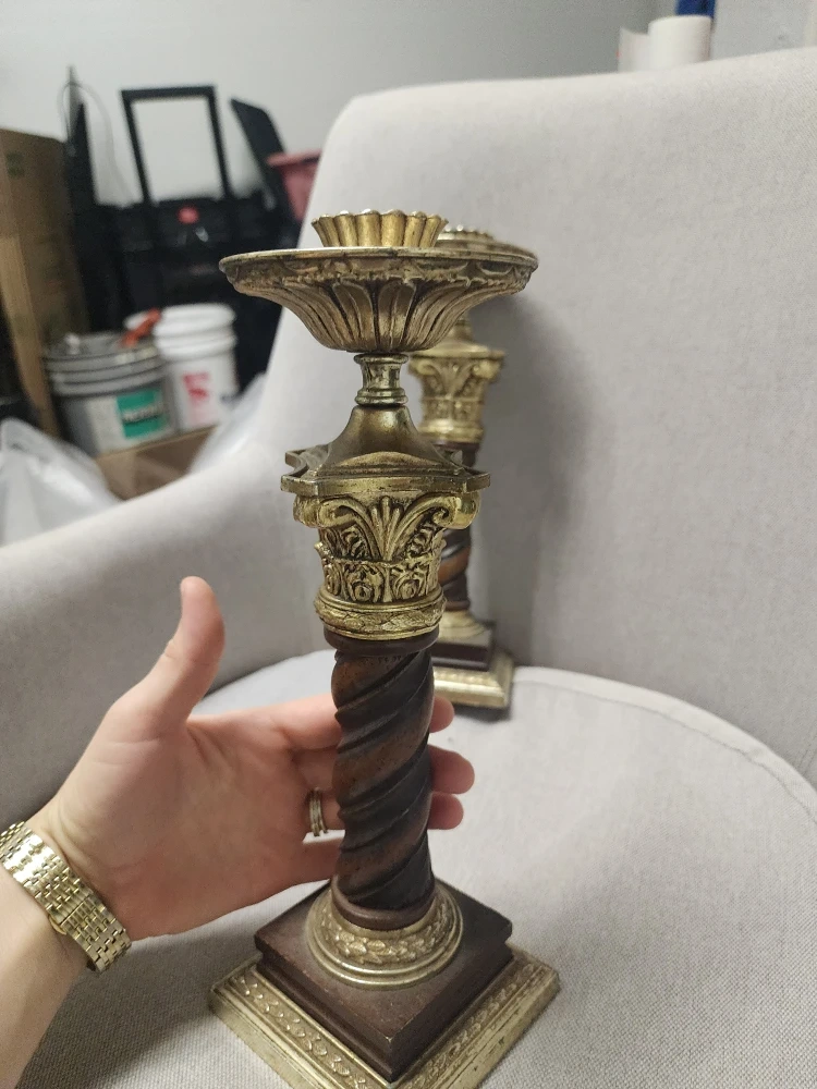 Selling a pair of candlestick holders. They are made of wood and metal and have a vintage style. They are in good condition and would look great in any home.