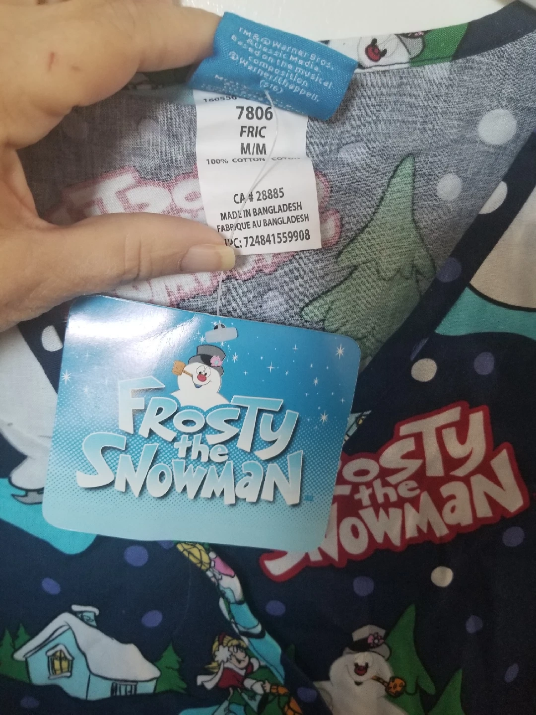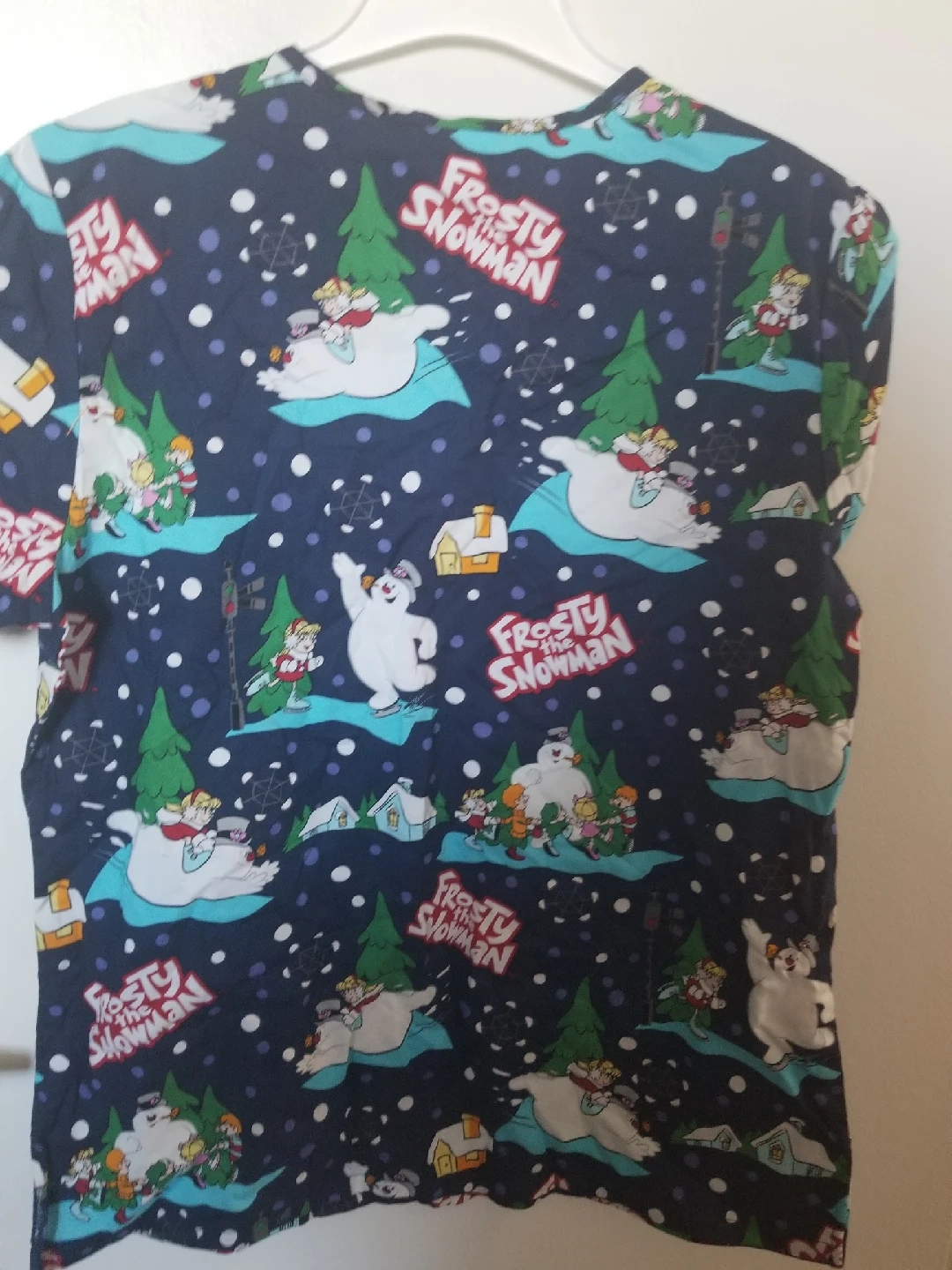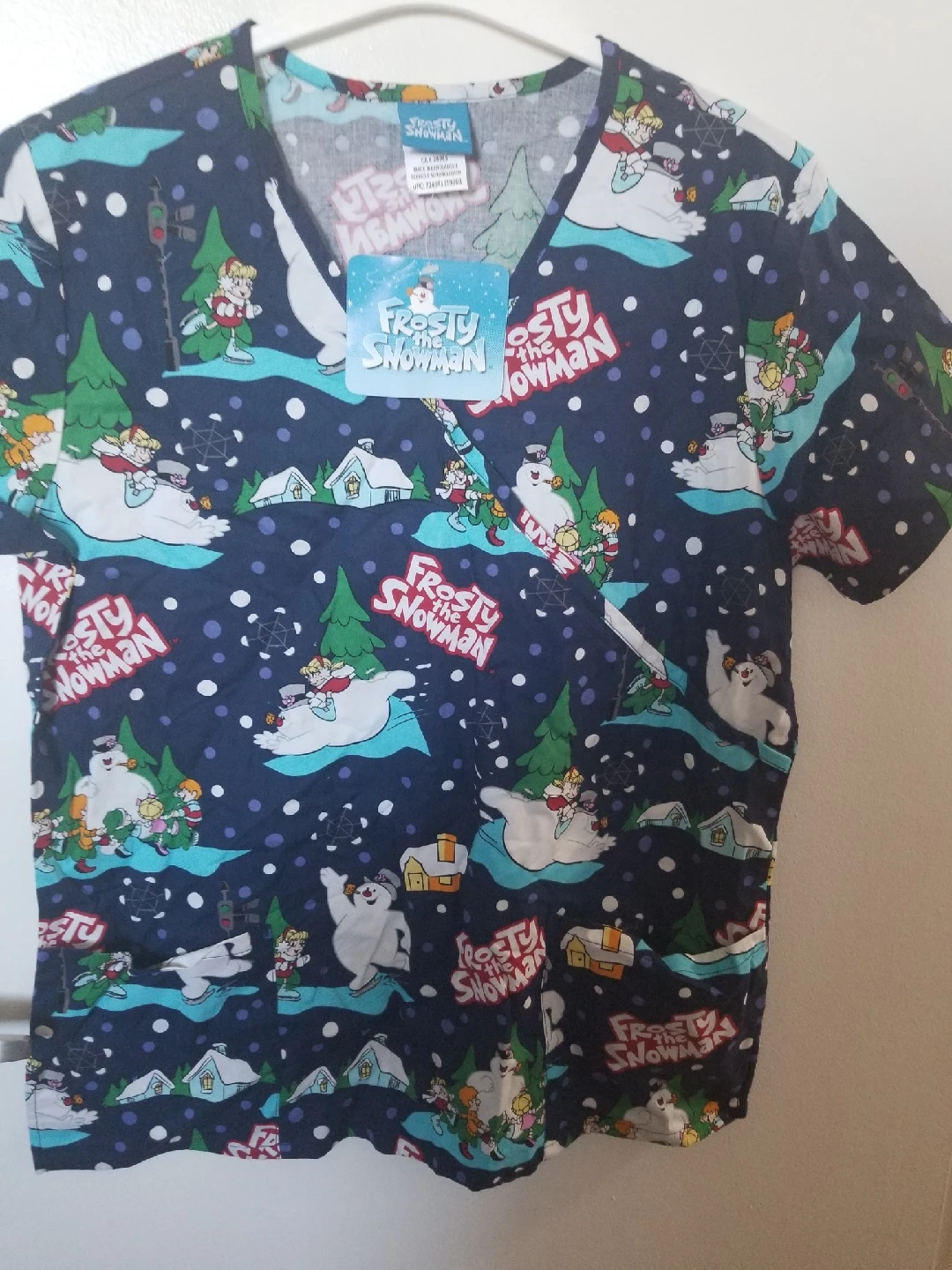 240Get ready for the holidays with this adorable Frosty the Snowman scrub top! It's a size M and made of 100% cotton, so it's comfy for long shifts. The fun print features Frosty and friends in a snowy scene. Perfect for medical professionals or anyone who loves a festive touch! New with tag