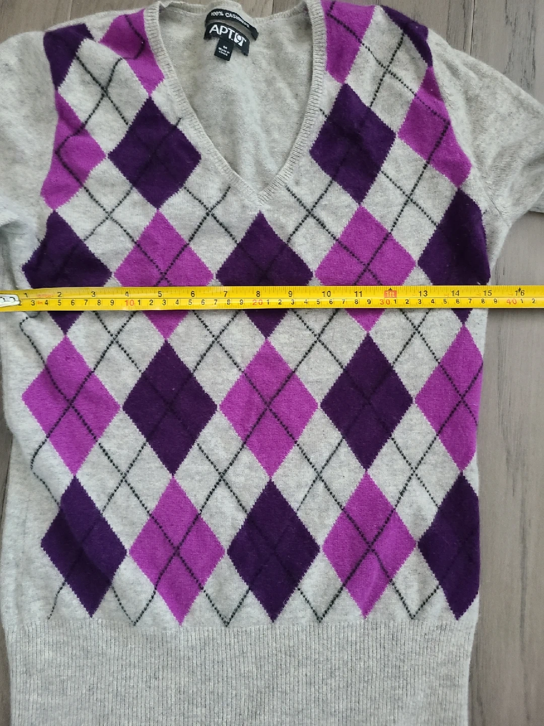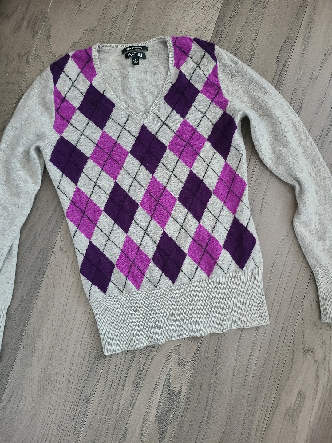 Cozy sweater made from 100% cashmere! It's a size medium and features a fun argyle pattern in shades of grey and purple. Perfect for staying warm and stylish this season.