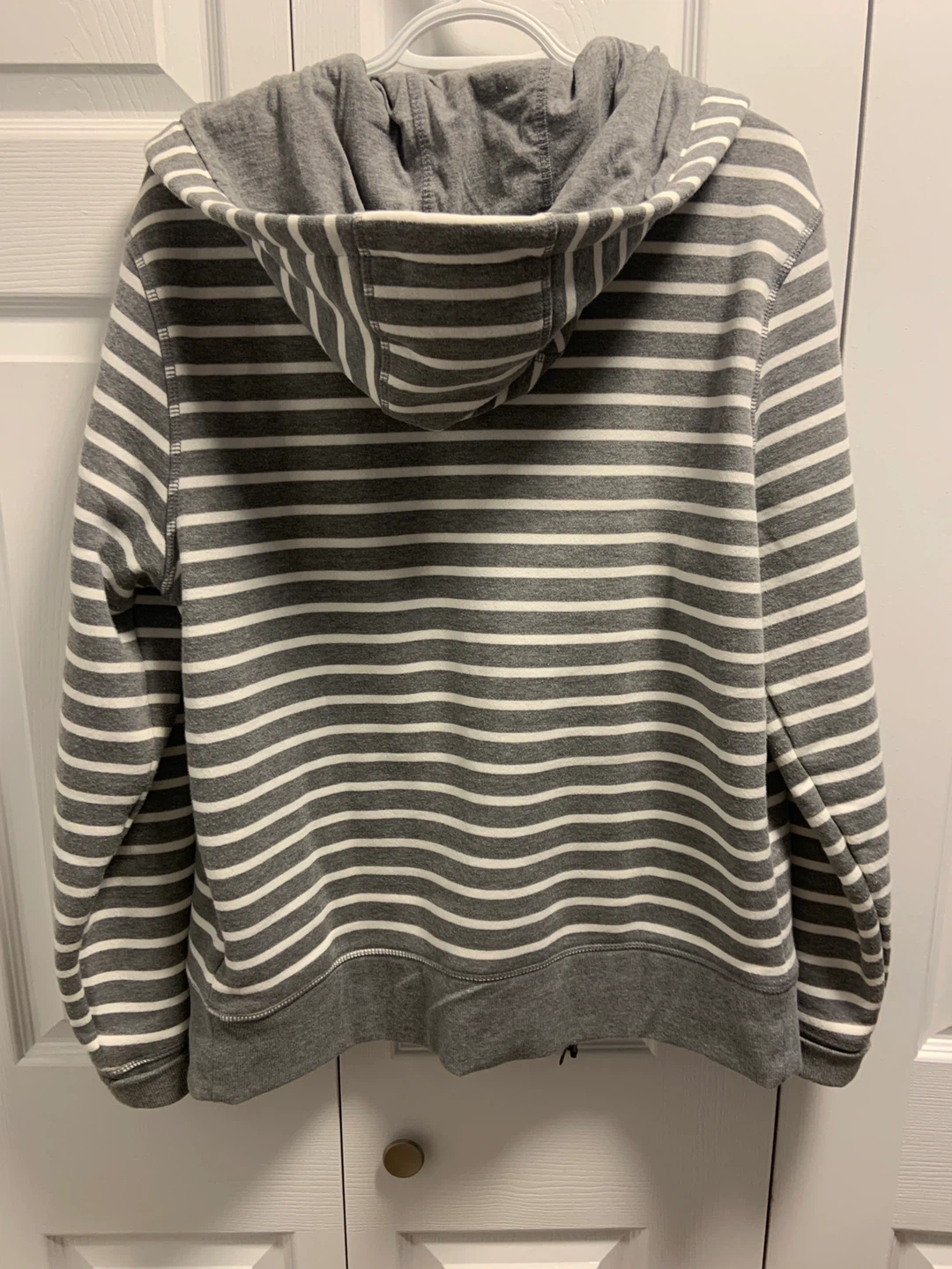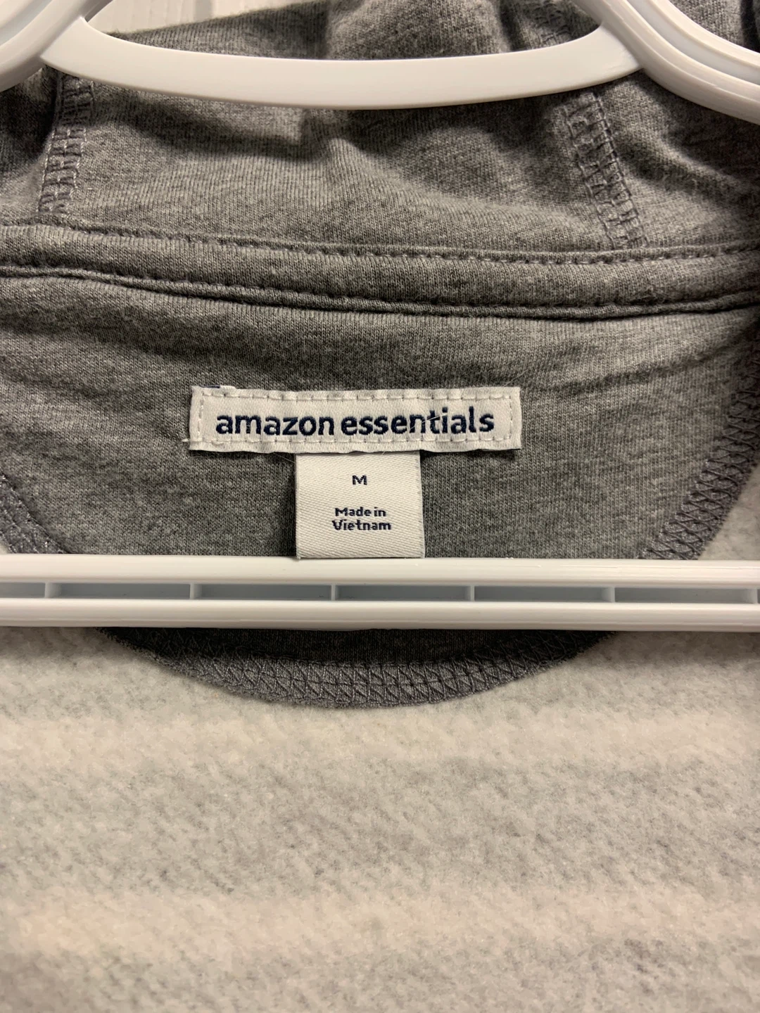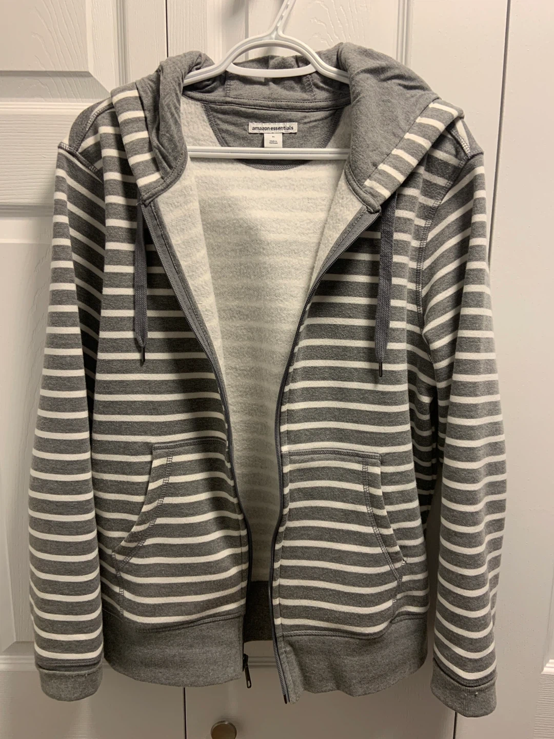 Selling an Amazon Essentials zip-up hoodie in a striped grey and white pattern! It's a size medium and in great condition. Perfect for layering or wearing on its own