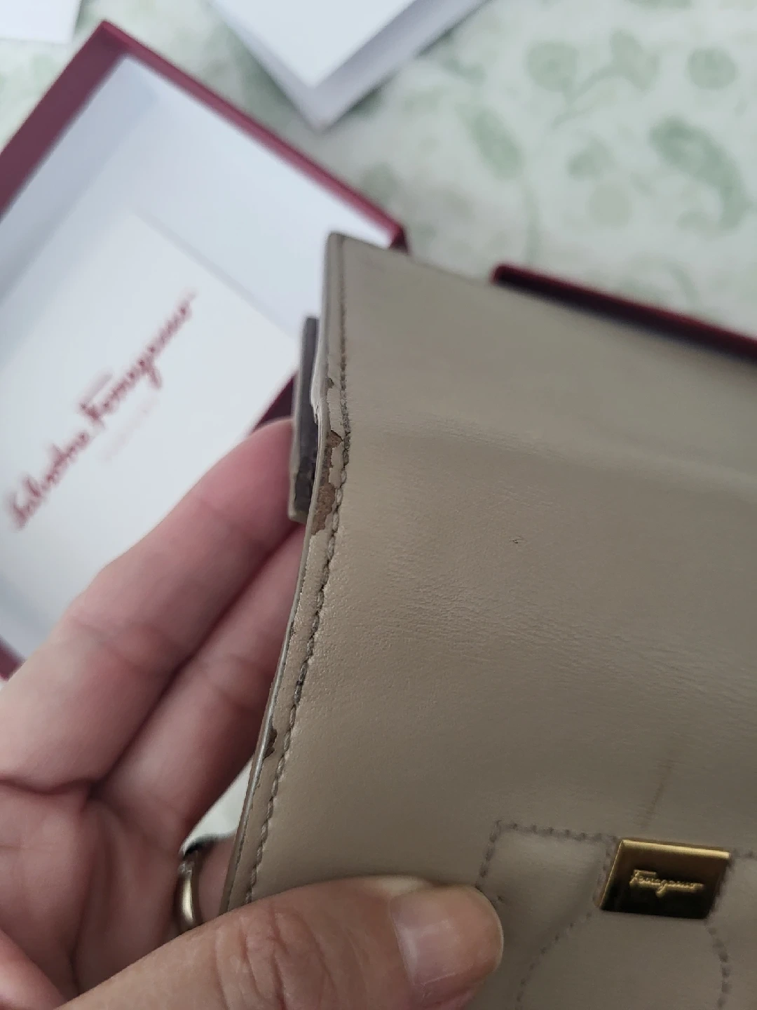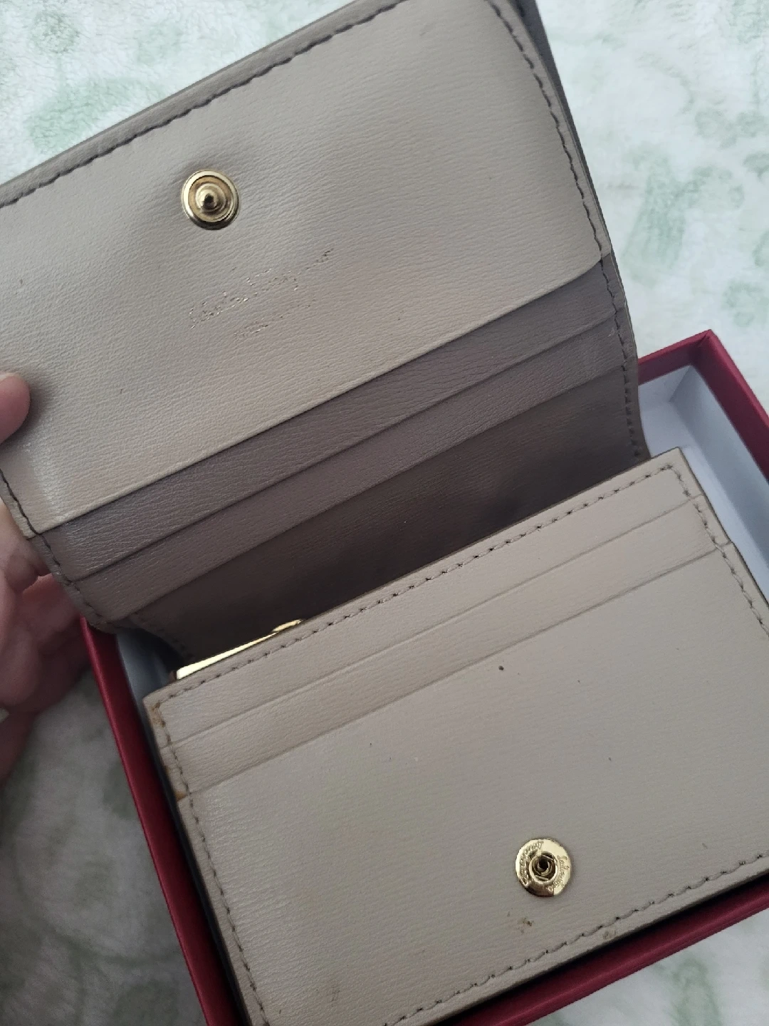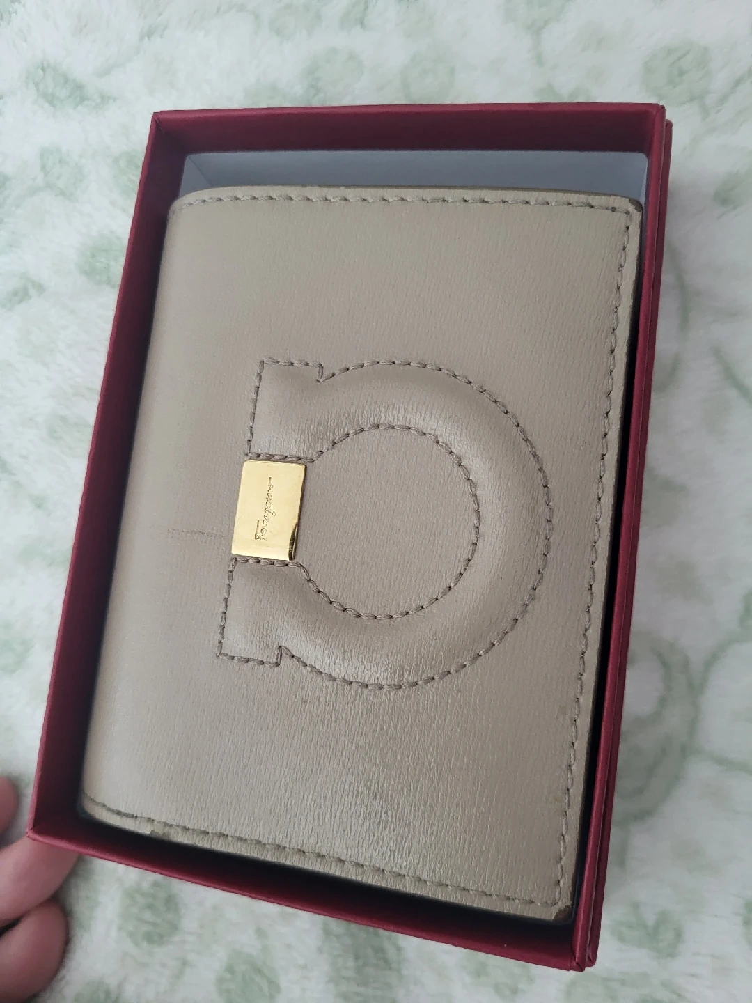 Salvatore Ferragamo card holder in a beautiful taupe colour, will paper bill holder and zipped coin holder. Comes with the original box! used, preloved.. some edges have cuffs, see photos but very nice to have. authentic. originally sold for $500
