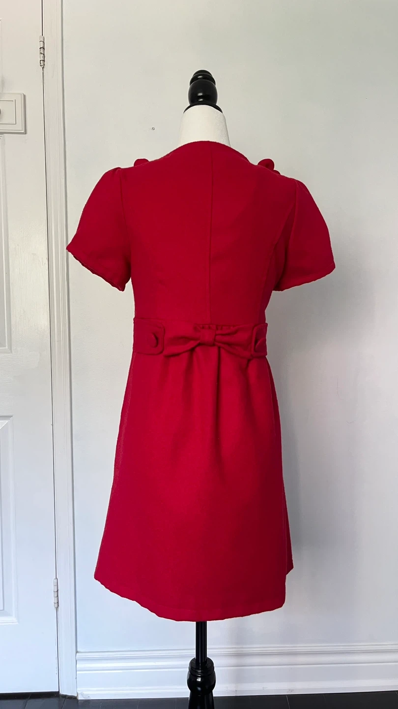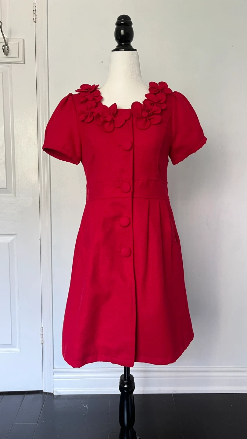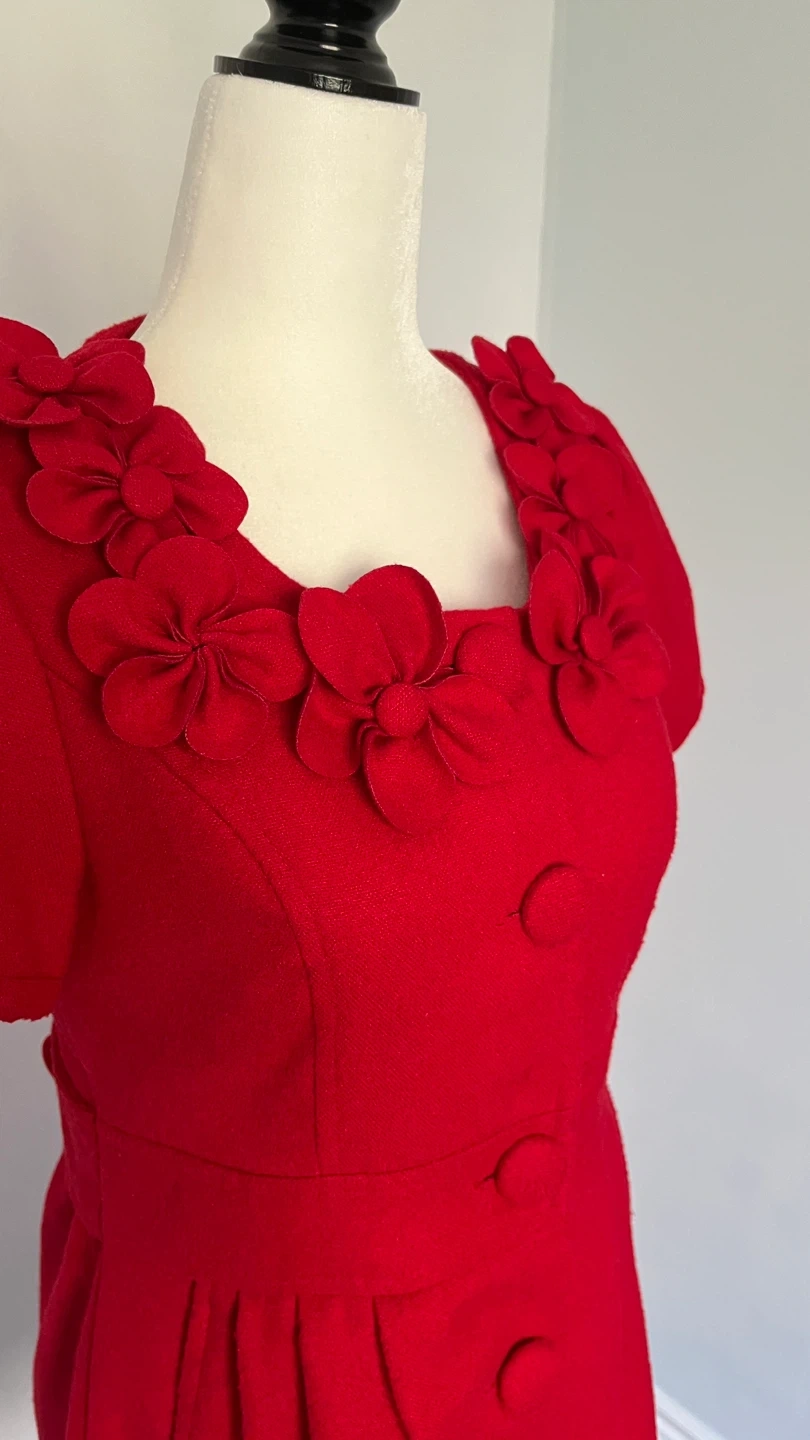 199Cutest statement dress! Bright red with big flower details around the neckline. Fully-lined wool short-sleeve dress jacket with two side pockets, and an adorable bow on the back! One flower around the neckline is missing a center button, but can be fixed easily with some creativity. Totally retro + fun. #vintagedress #redvibes #flowerdetails #retrostyle #secondhandfinds #thriftedfashion #vintageaesthetic #elegant #jacketdress
