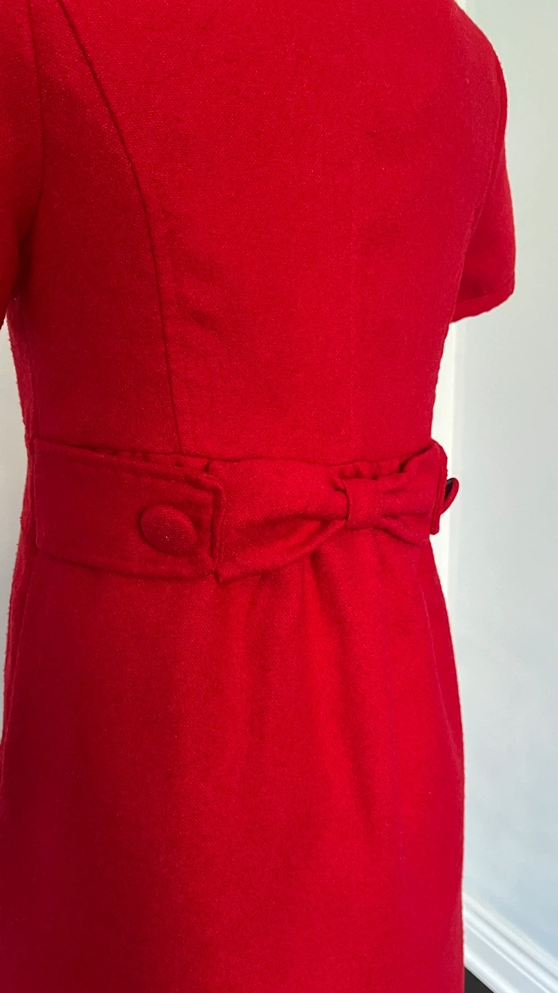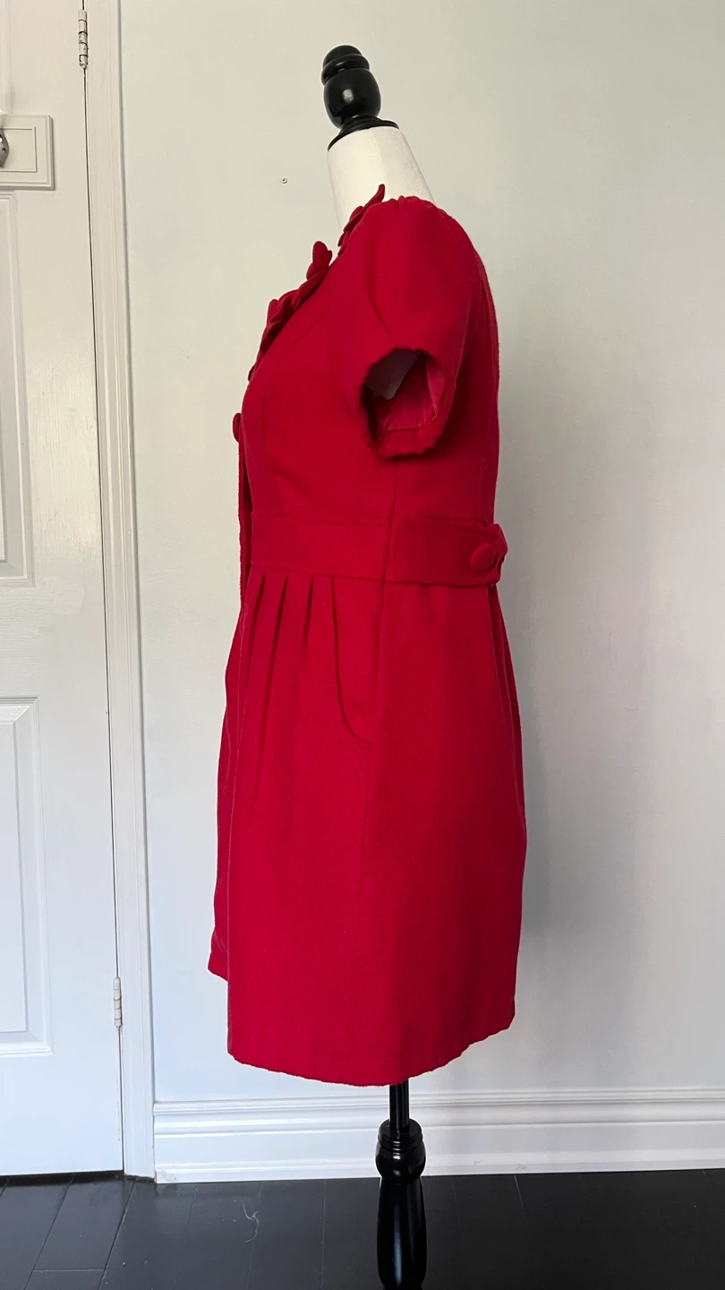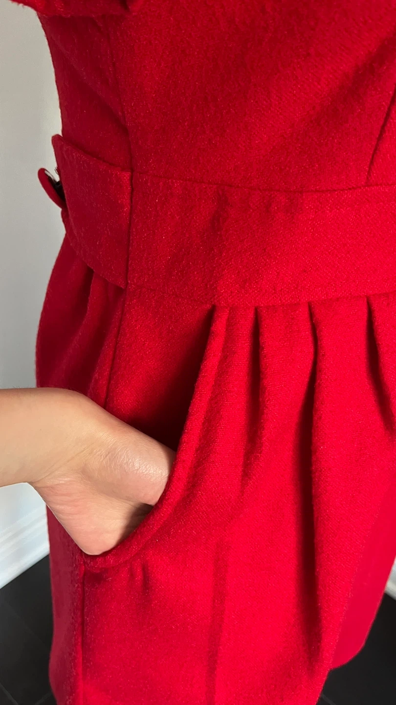199Cutest statement dress! Bright red with big flower details around the neckline. Fully-lined wool short-sleeve dress jacket with two side pockets, and an adorable bow on the back! One flower around the neckline is missing a center button, but can be fixed easily with some creativity. Totally retro + fun. #vintagedress #redvibes #flowerdetails #retrostyle #secondhandfinds #thriftedfashion #vintageaesthetic #elegant #jacketdress