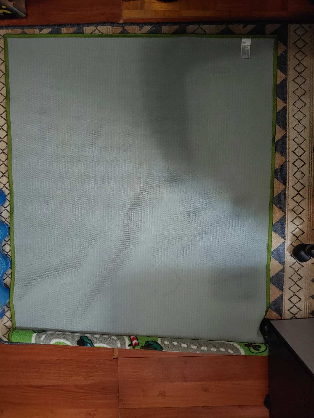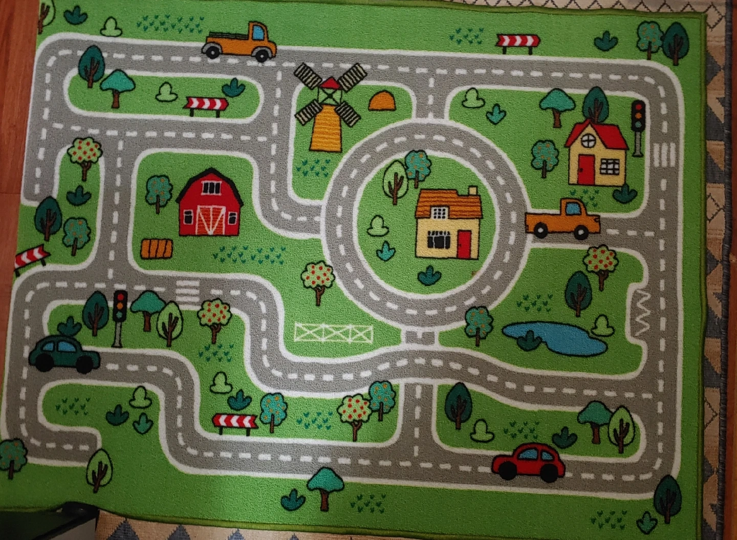 Selling a Mastermind Toys road rug in great condition! The rug features a fun road design with houses, trees, and other details. Perfect for kids to play on and use their imagination. The rug is made of polyester.