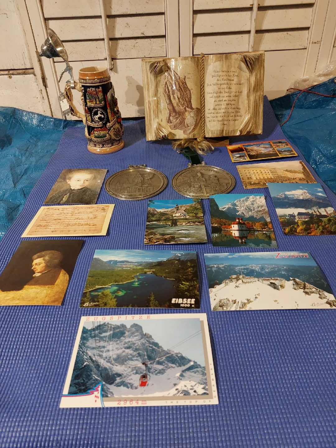 Selling a collection of vintage German items, including a decorative beer stein, zinc plate featuring Neuschwanstein castle and Mainz, "Lord's prayer" in German language, postcards featuring Zugspitze and Eibsee, specially for Mozard, and other memorabilia. A unique set for collectors!