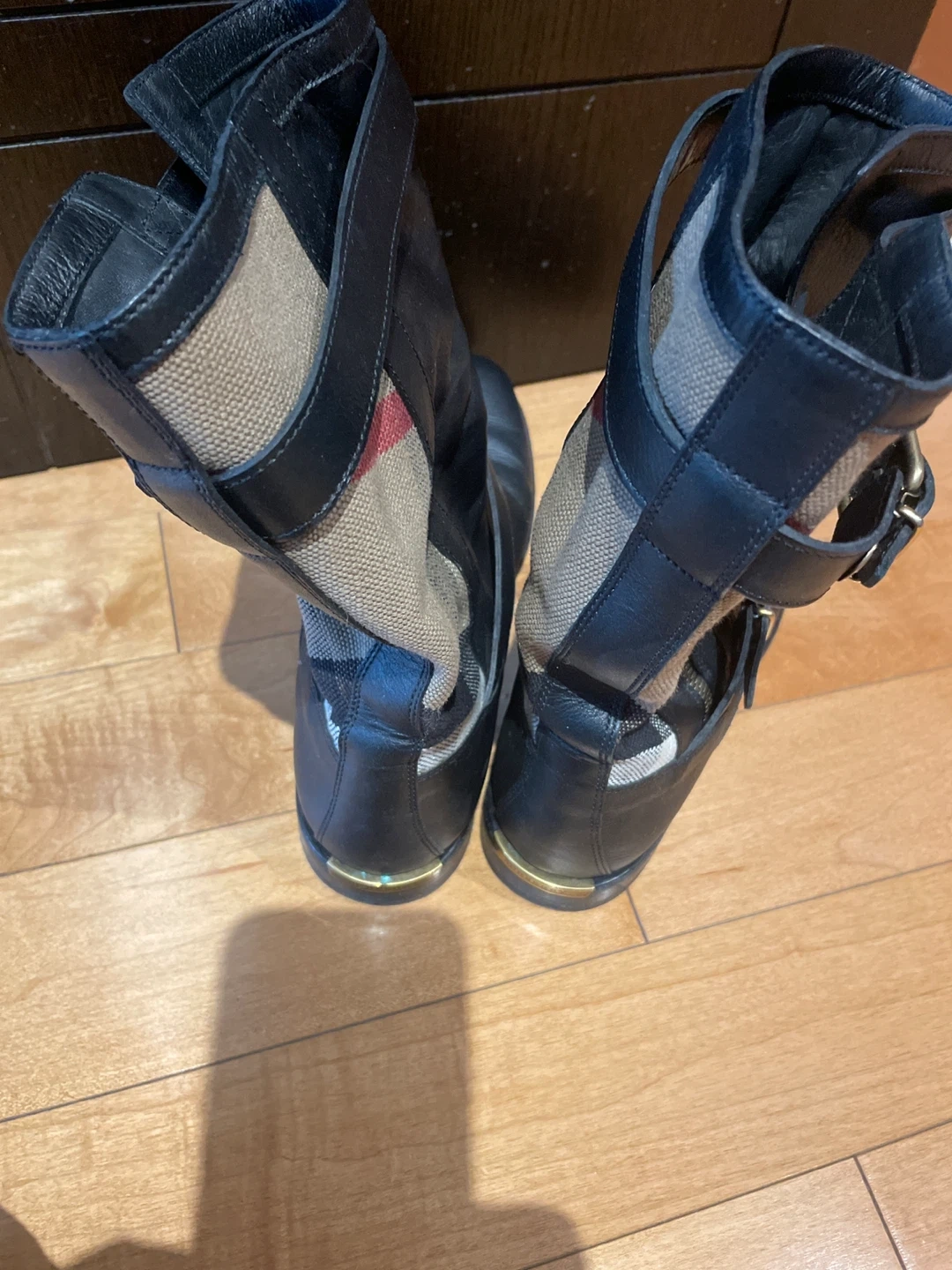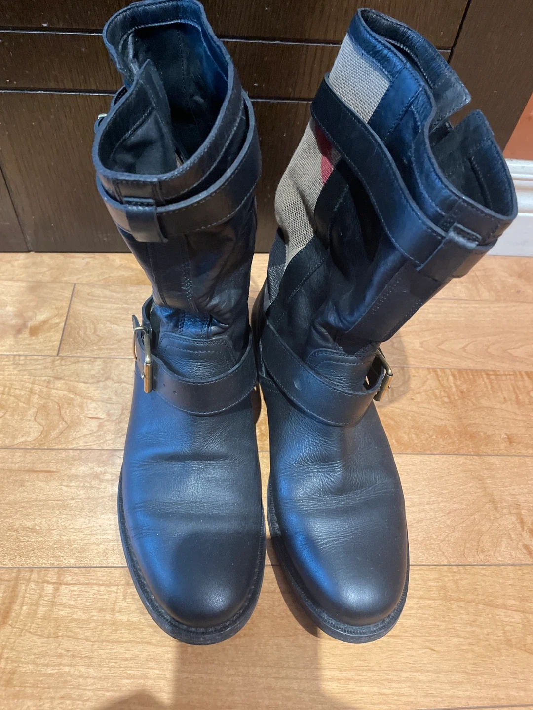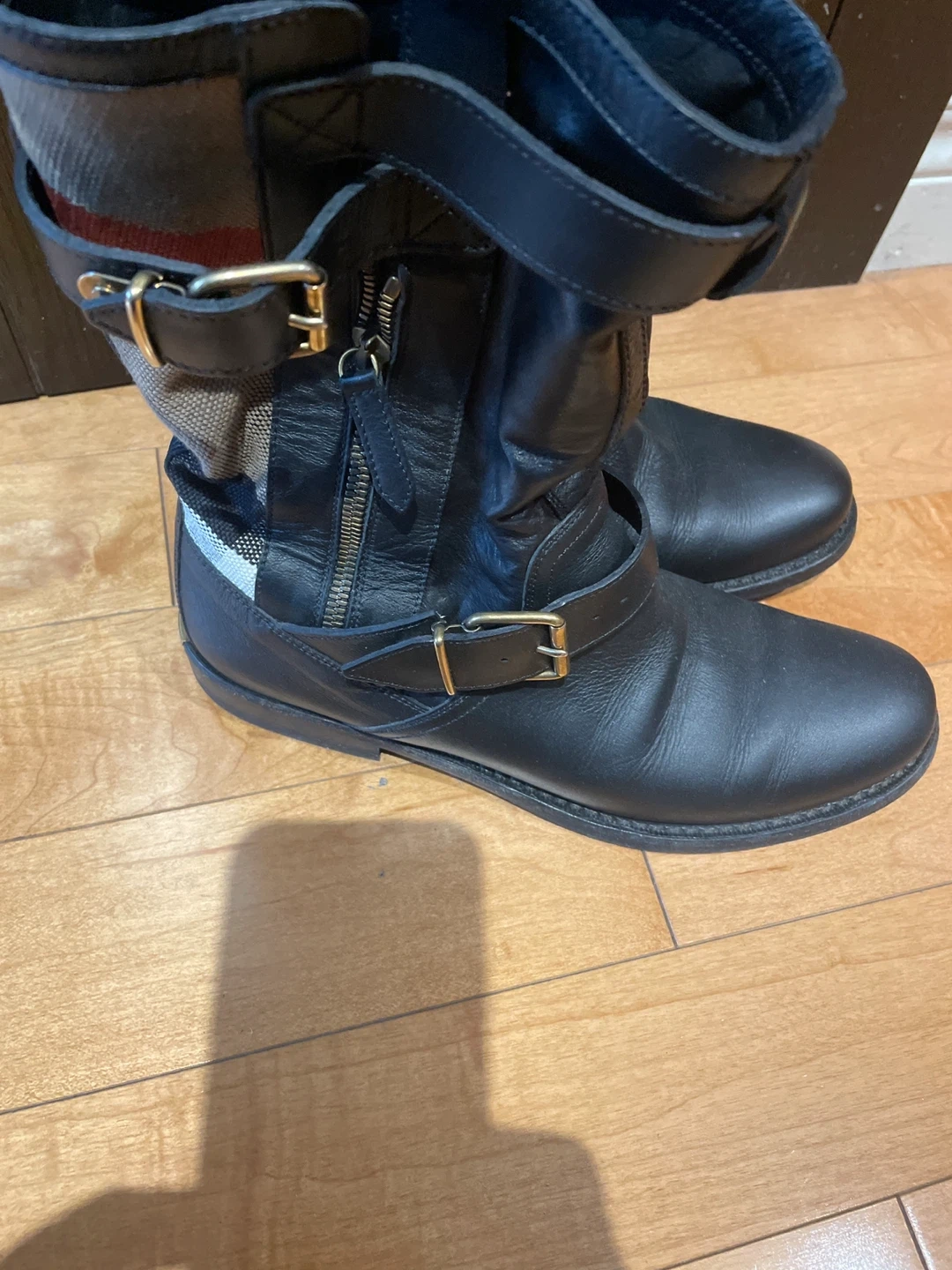 26Selling a pair of Burberry black leather boots. They feature a buckle design and the classic Burberry check pattern. The size is 39.
