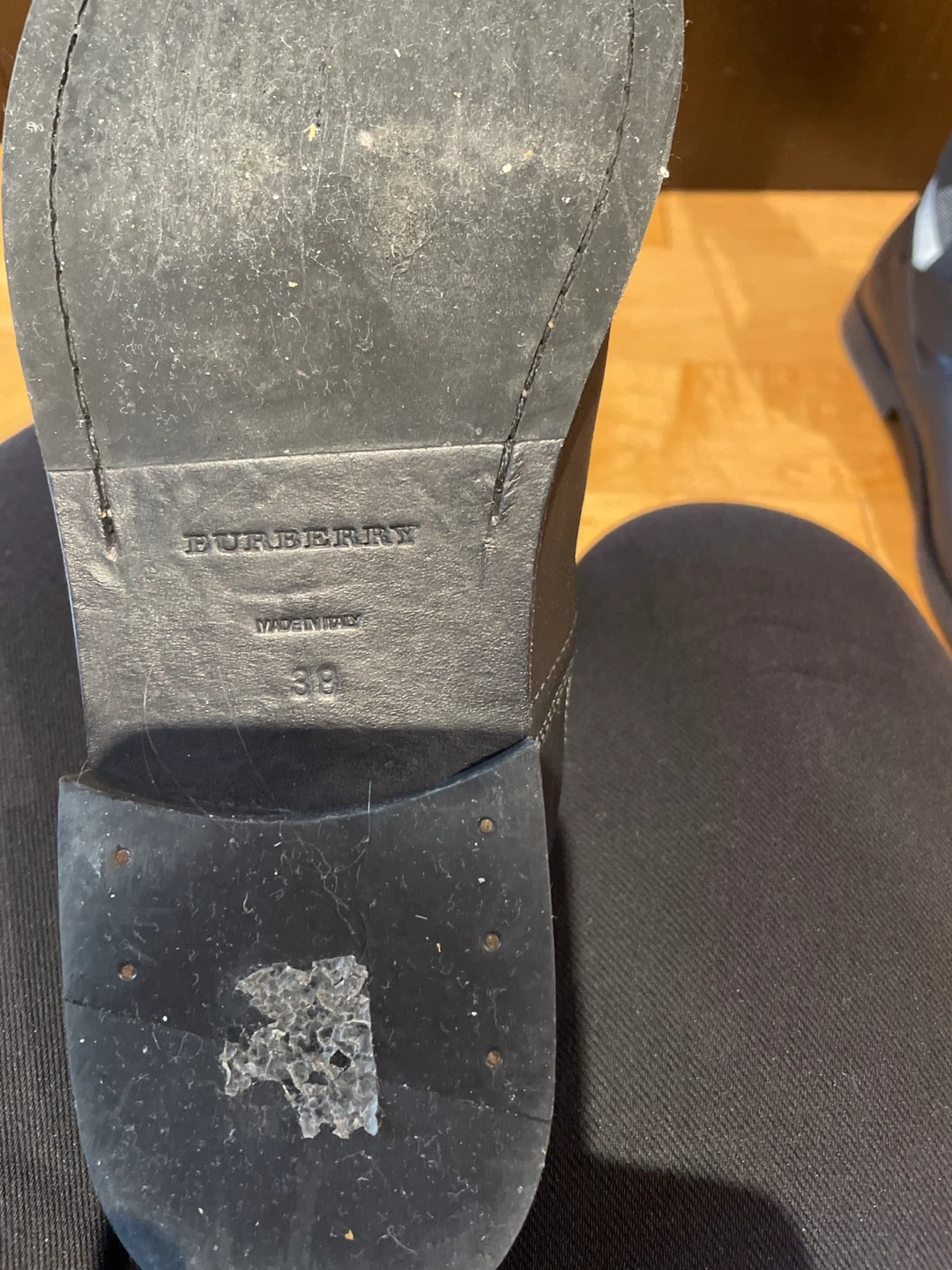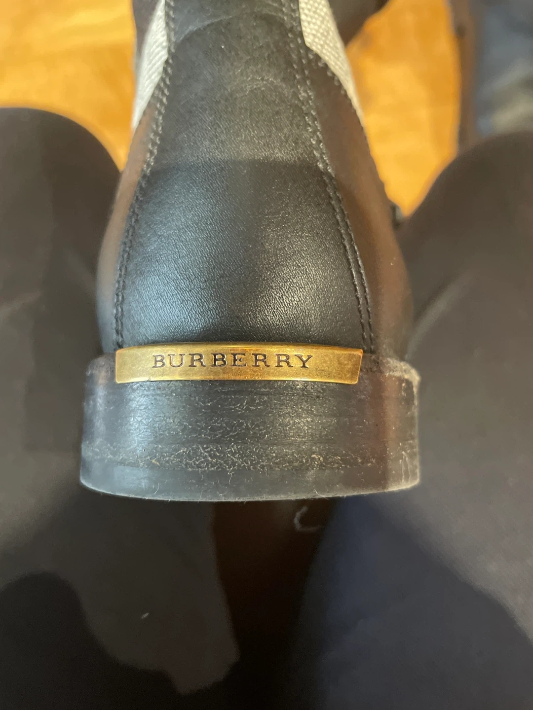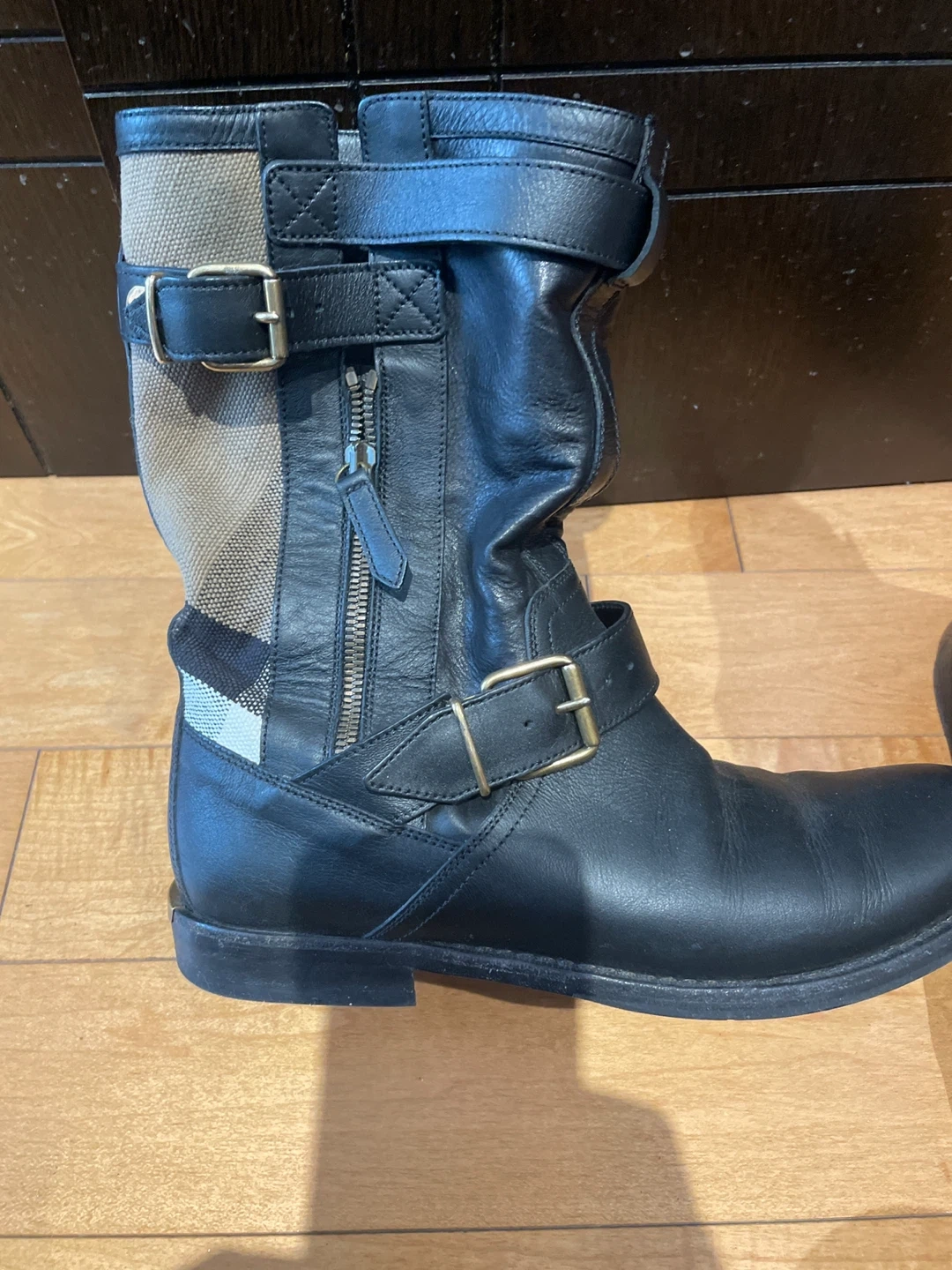 26Selling a pair of Burberry black leather boots. They feature a buckle design and the classic Burberry check pattern. The size is 39.