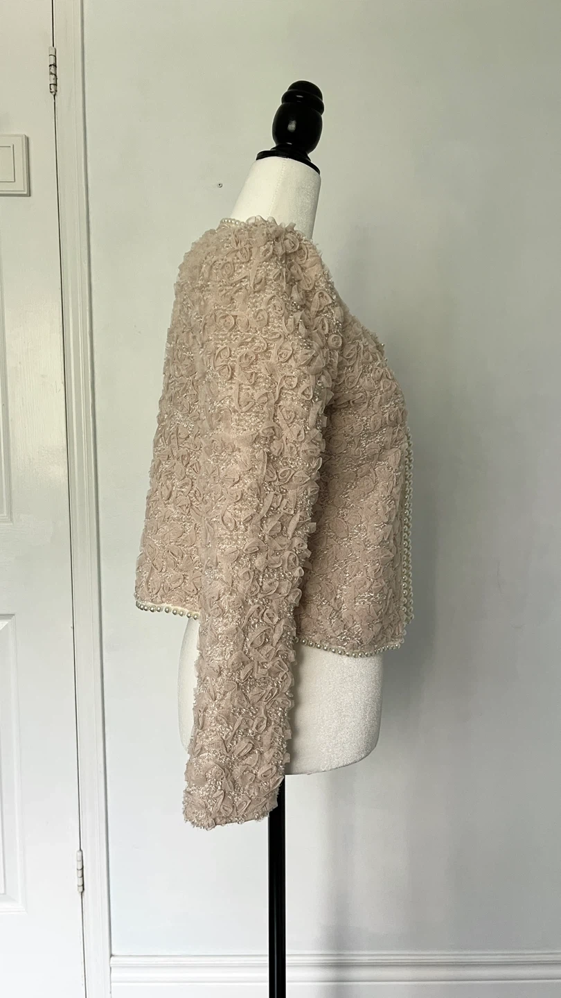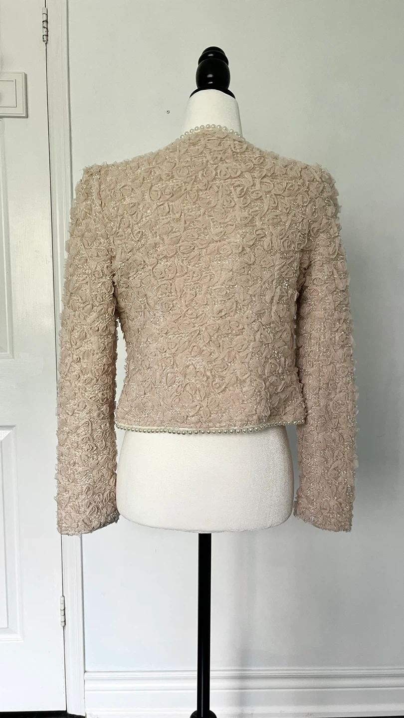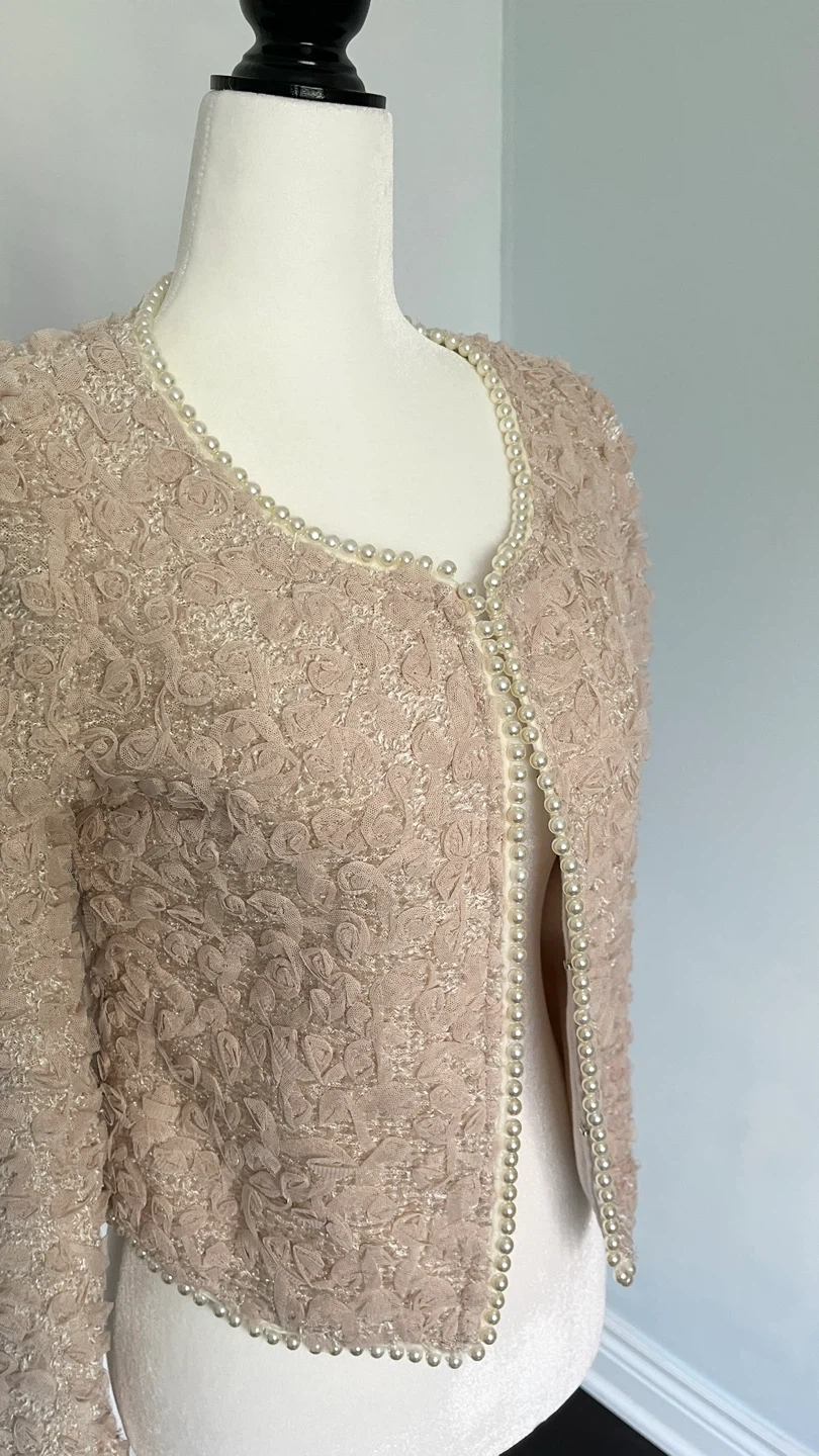 199The sweetest vintage jacket! Textured floral fabric with pearl trim — romantic + elegant. Perfect piece to wear for a fancy occasion and add some glamour to your look! #vintagejacket #pearlstyle #retroglam #vintagelook #secondhandstyle #sustainablefashion #classyvintage #trimsandembellishments #tulle #pearls #specialoccasion