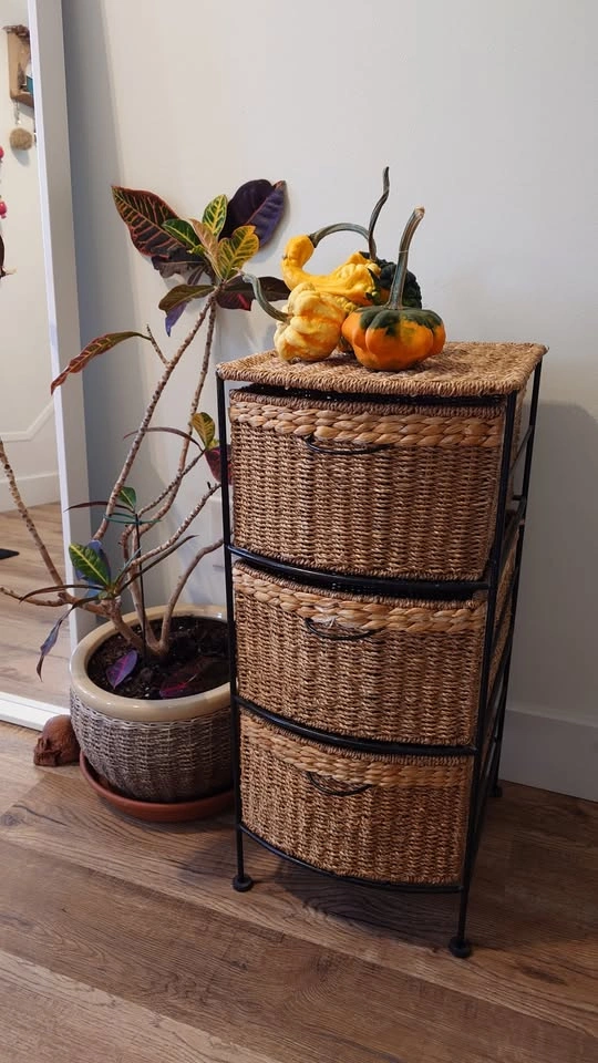 3 Drawer Wicker Chest. The drawers slide in and out pretty smoothly and will provide ample storage even for a tight space. The structure is metal, including the legs and handles.