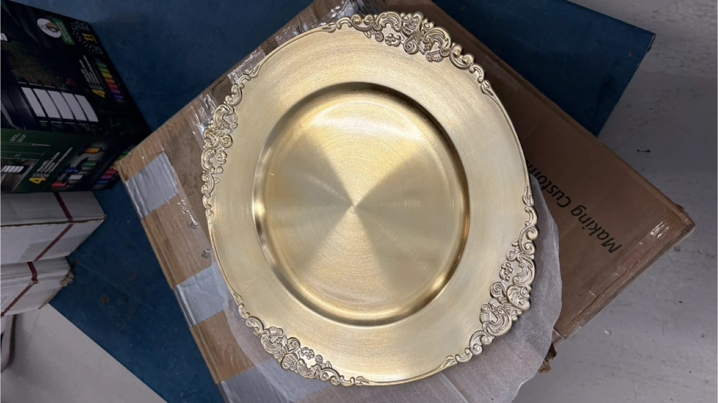 Selling a gold charger plate. It's in great condition and would be perfect for adding a touch of elegance to your dining table or special event