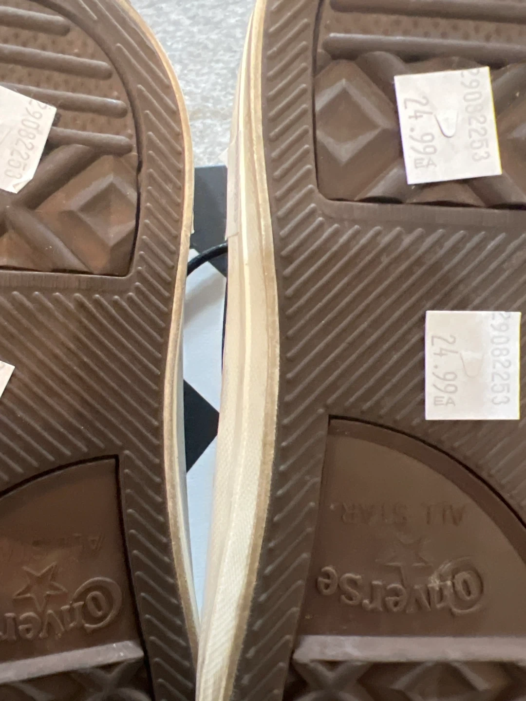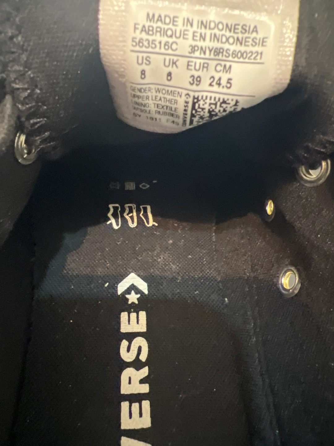 1000+Selling a pair of Converse Chuck Taylor All Star sneakers in black leather. These have a unique scallop design and gold eyelets. They are a women's US size 8. The original price sticker on the sole shows $24.99. Paid at VV too small. Never wore. BRAND NEW. Comes with the original box!