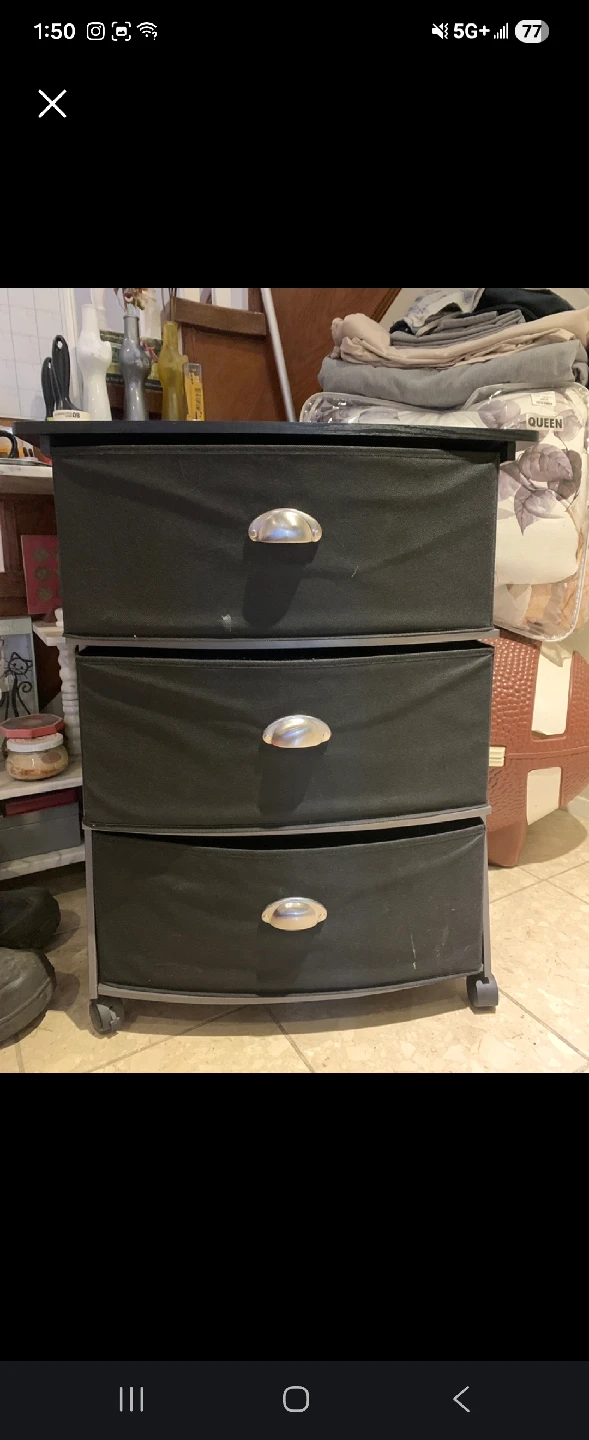 black 3-drawer storage unit for organizing clothes or other items. The drawers are made of a fabric-like material and have silver-toned handles. It also has wheels for easy moving around