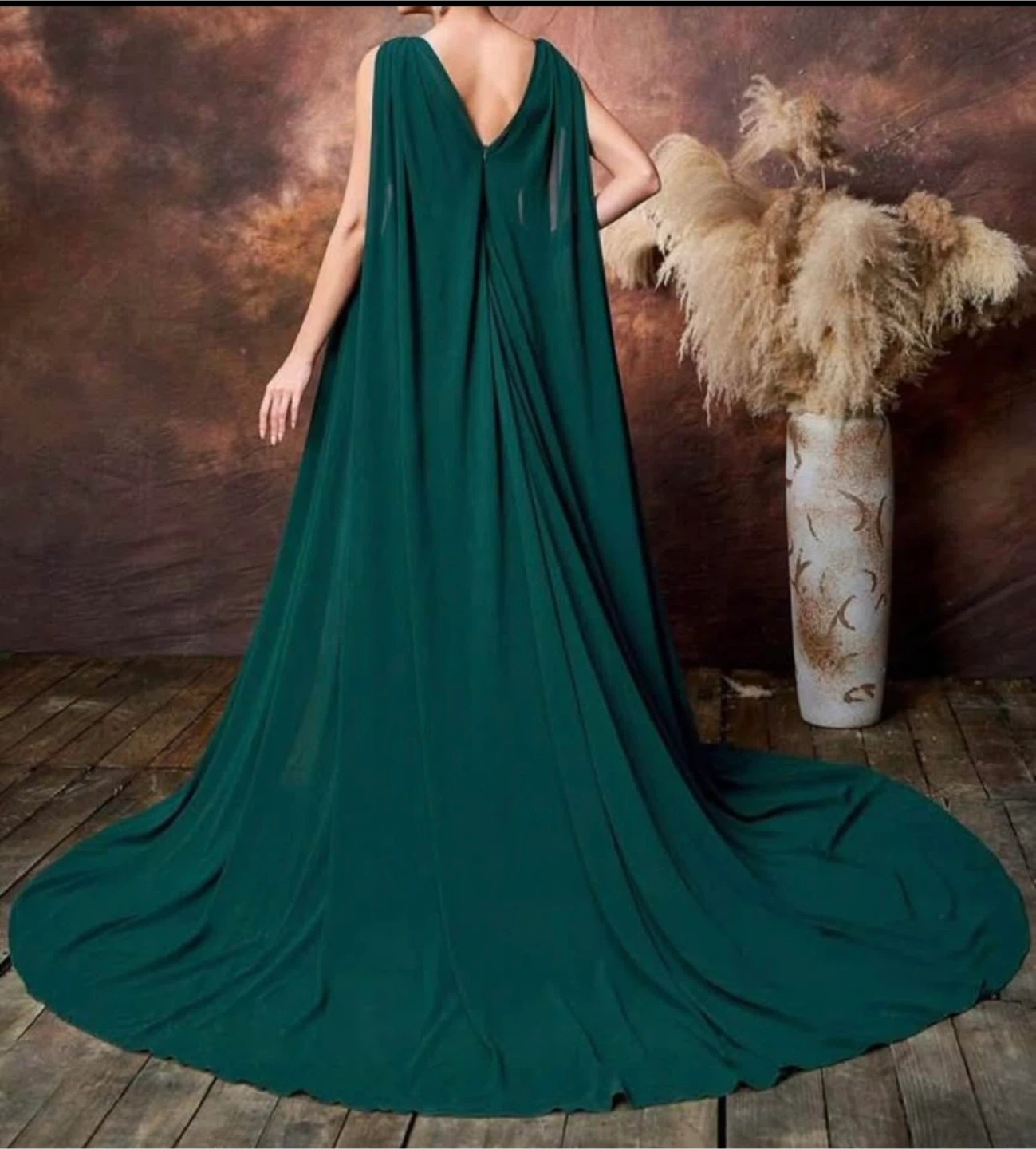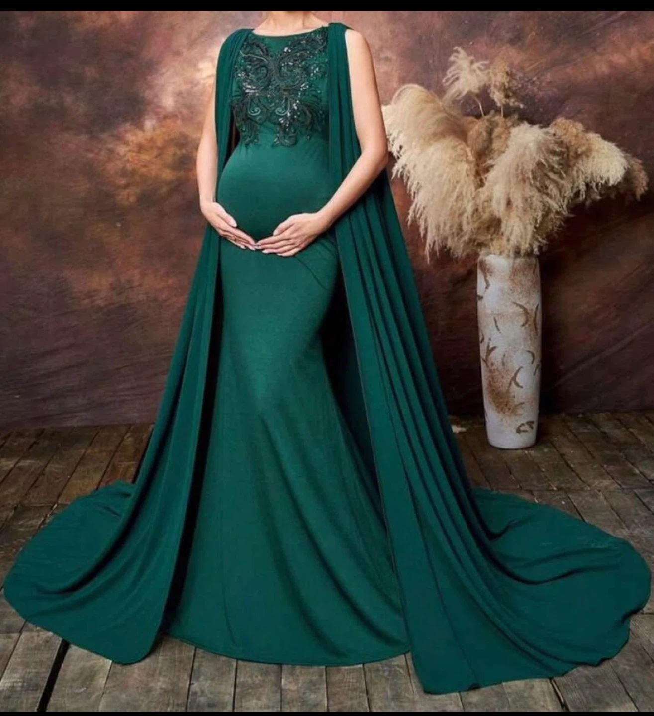 Beautiful emerald green maternity dress, perfect for a photoshoot or special occasion! The dress features a flowing cape and elegant design.