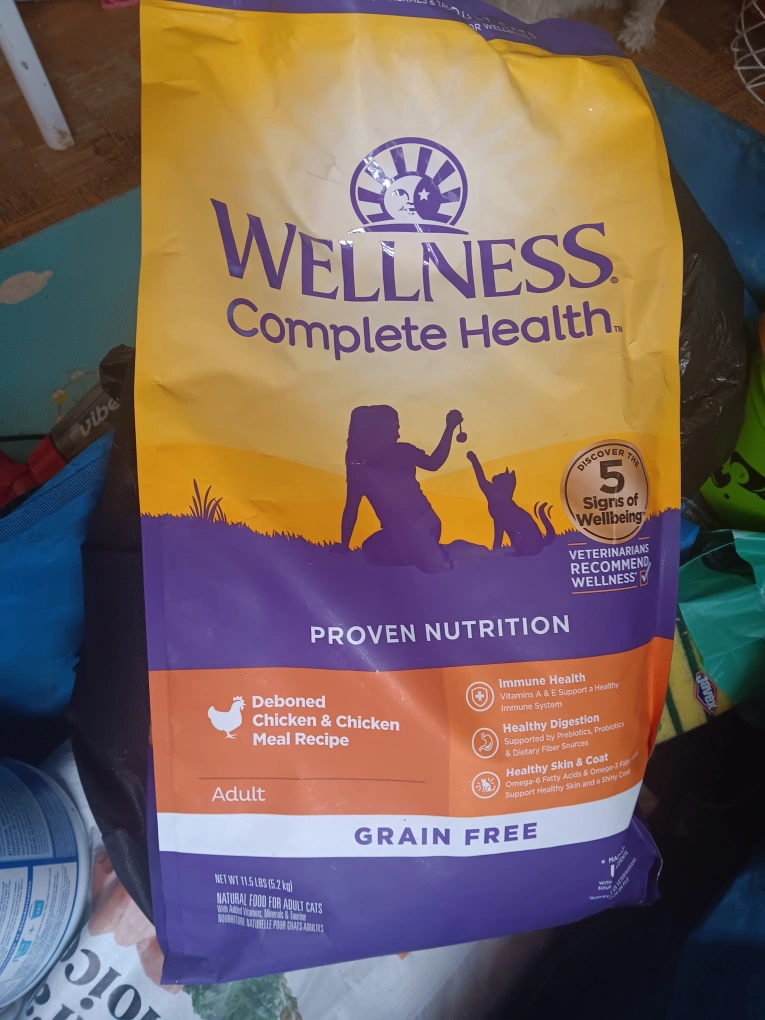 1000+Selling a sealed bag of Wellness Complete Health cat food for adult cats . It's a natural food with added vitamins, minerals, and taurine. The recipe features deboned chicken and chicken meal. It's grain-free and supports immune health, healthy digestion, and a healthy skin and coat. Net weight is 11.5 lbs (5.2 kg) 647-203-0411
