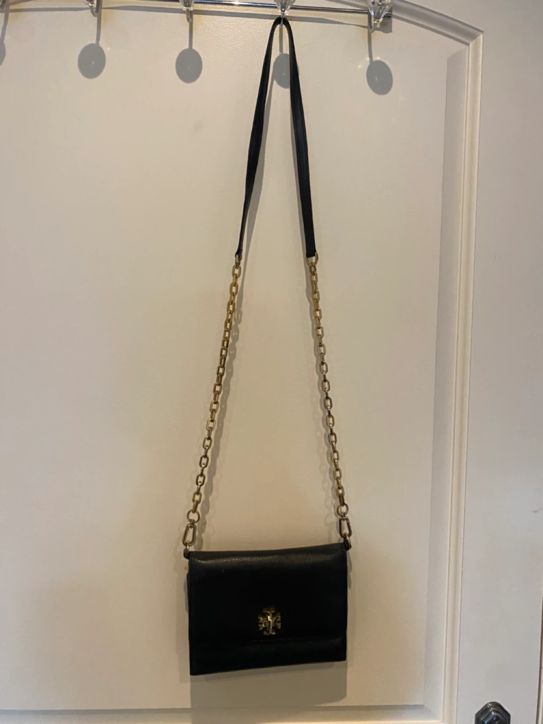 Selling a stylish Tory Burch black leather crossbody bag! It features a gold chain strap and the iconic Tory Burch logo. Perfect for adding a touch of elegance to any outfit
