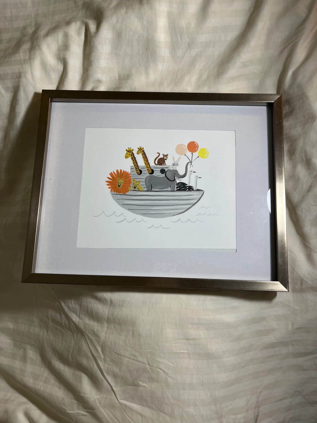 A silver frame with a print of a lion, giraffe, monkey, rabbit, elephant, and more.