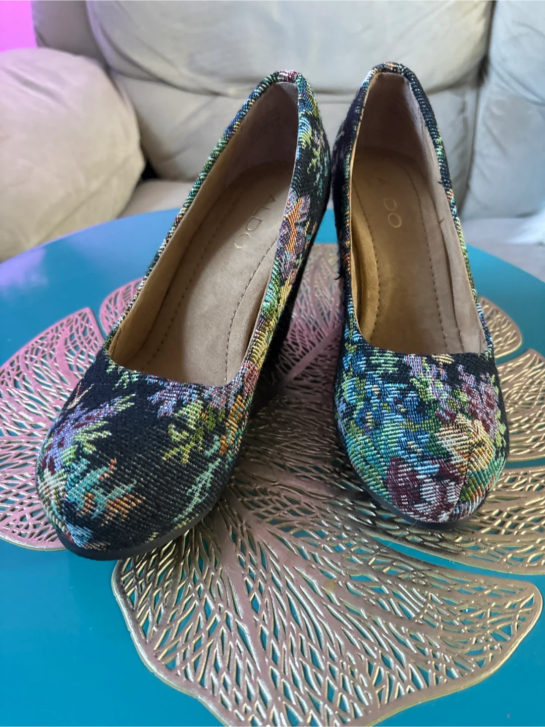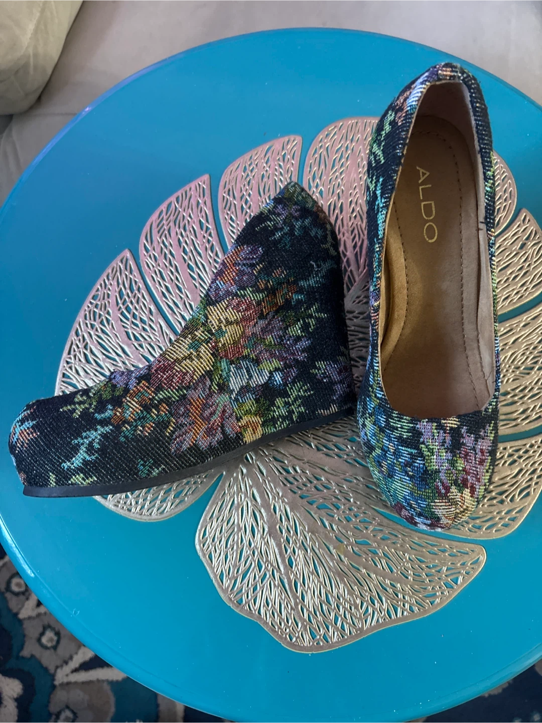 Cute Aldo wedge heels in a floral pattern! They are a size 6.5 and in great condition. Never been worn.
