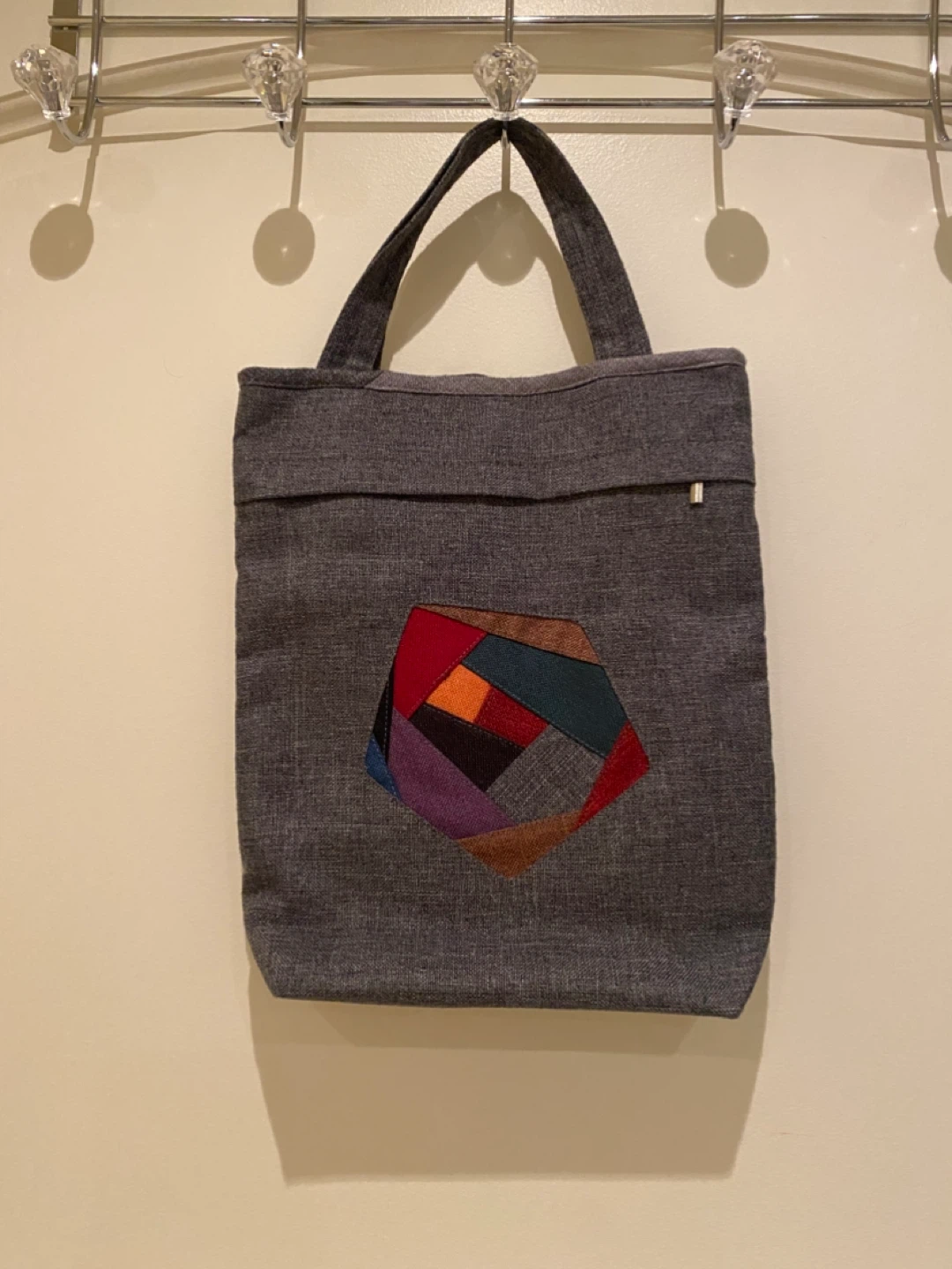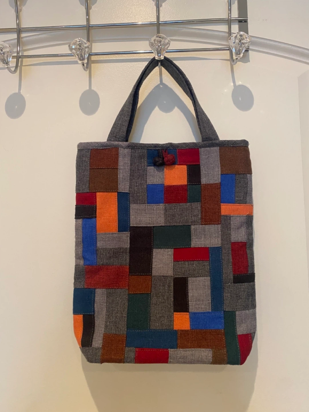 Check out this unique patchwork tote bag! It features a colourful and eye-catching design with various shades of grey, brown, orange, blue, and red. Perfect for carrying your everyday essentials in style!
