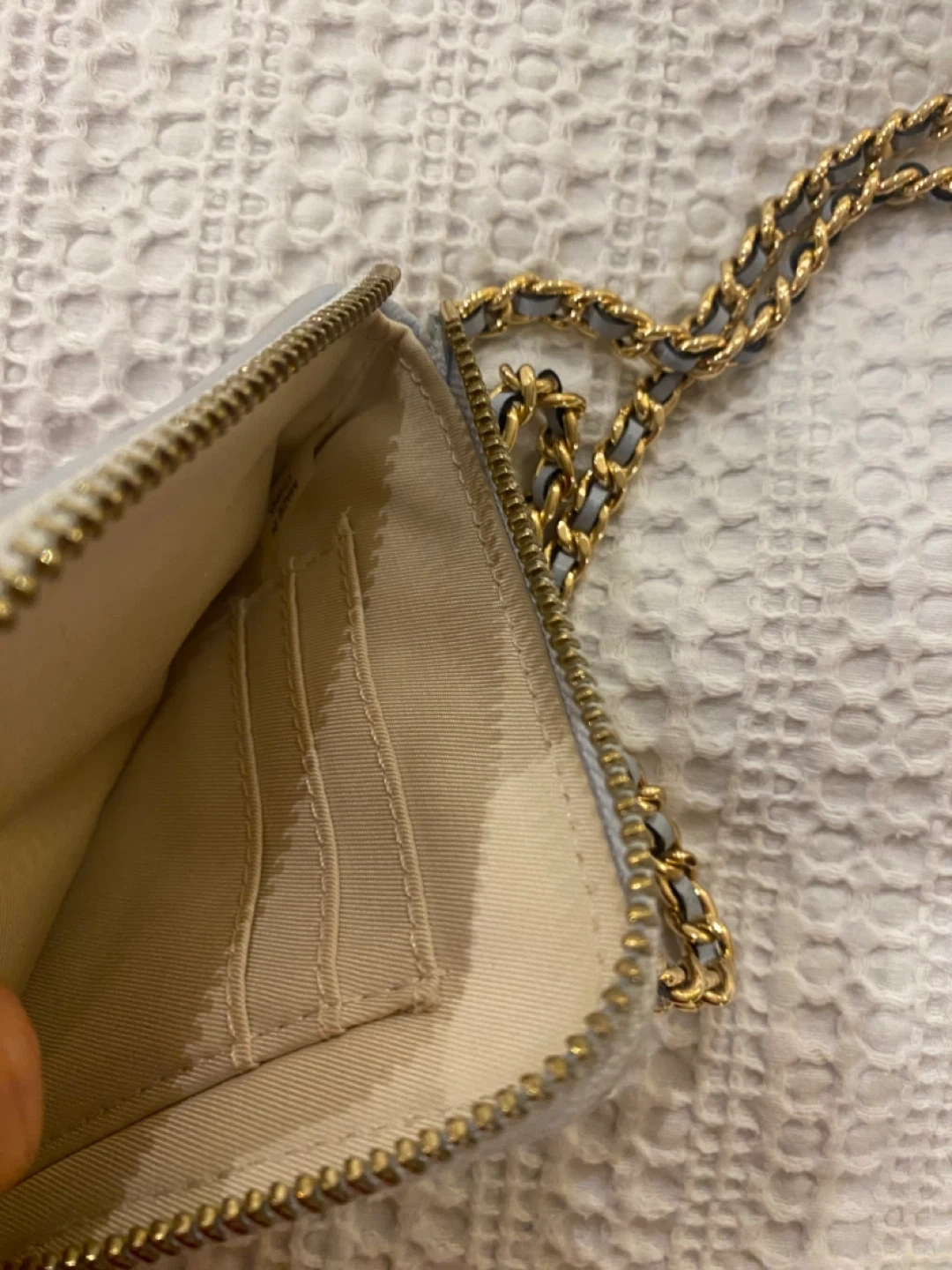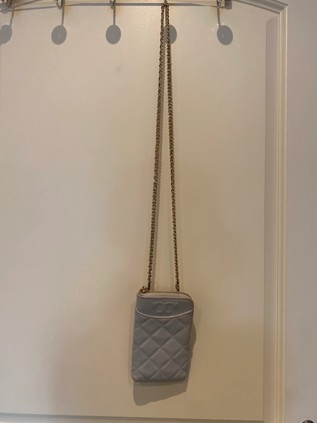 Selling a Tory Burch quilted leather phone crossbody bag in a lovely blue colour. It's perfect for carrying your phone and a few essentials when you're on the go. The bag features a quilted design and a chain strap for a stylish look!
