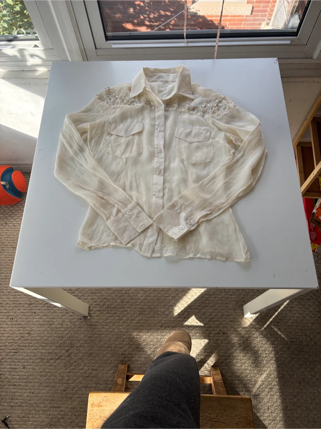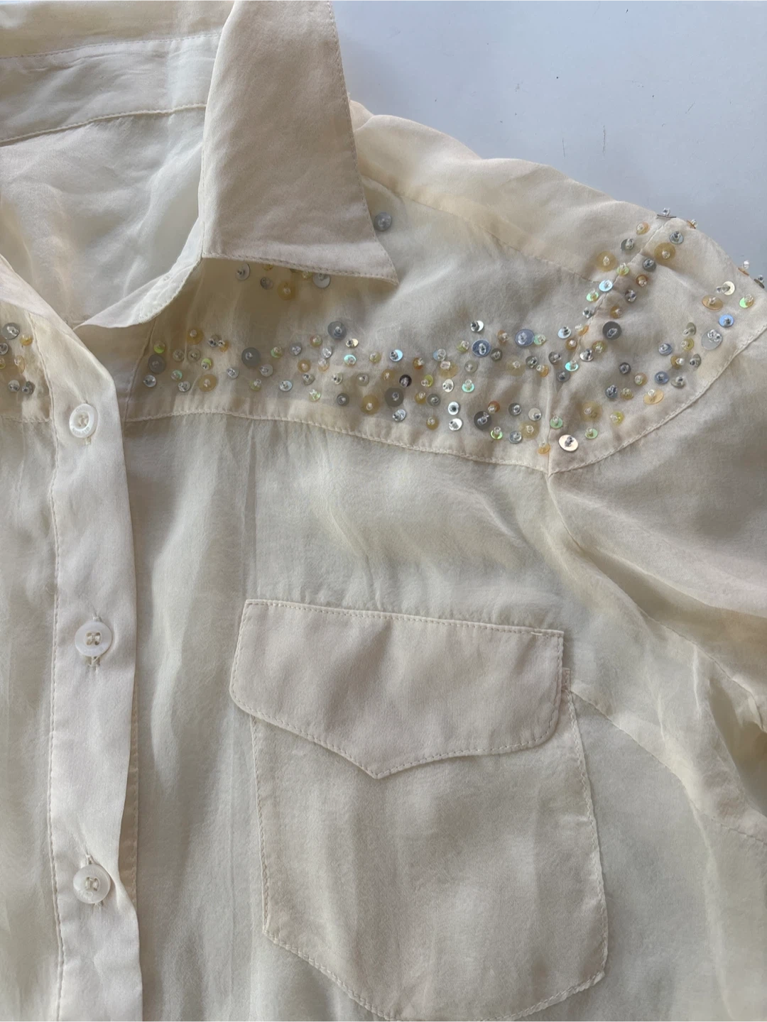 375A lovely cream-sill blouse with delicate embellishments around the collar and shoulders. It features long sleeves and two front pockets. Perfect for adding a touch of elegance to any outfit!