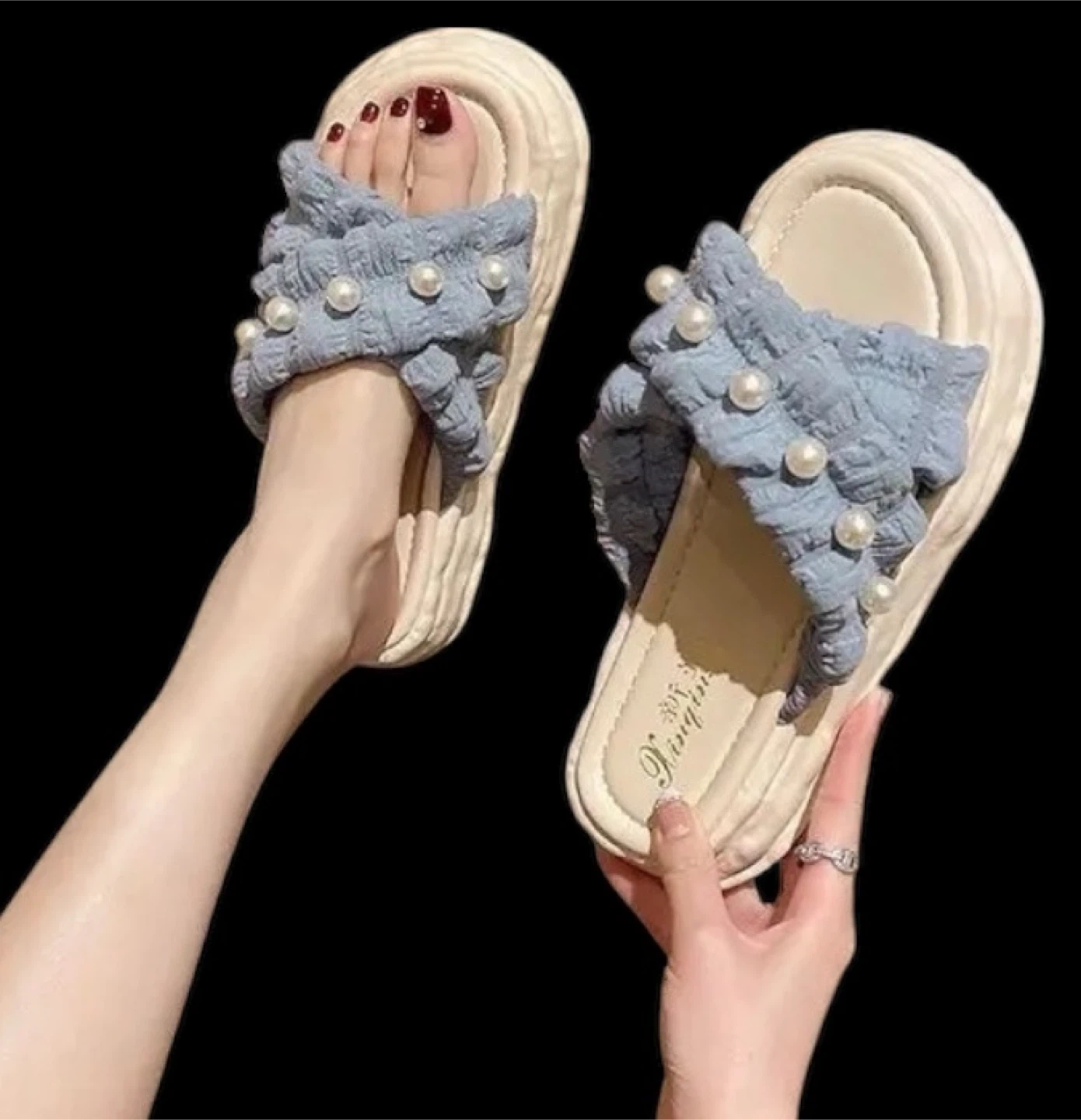 Cute blue platform sandals with pearl accents! These are super stylish and comfy for everyday wear. They're lightweight and easy to slip on, perfect for running errands or just relaxing at home