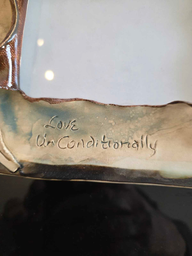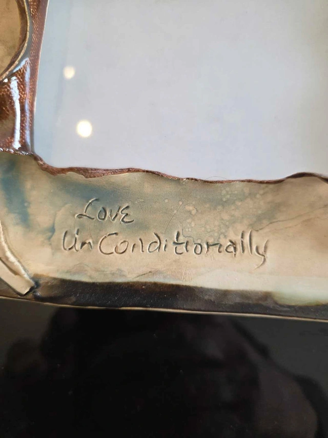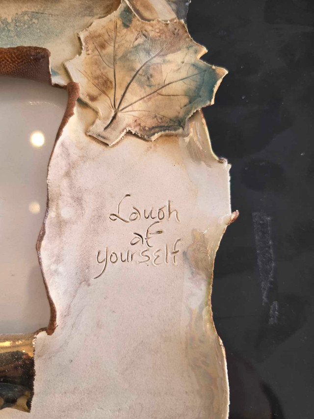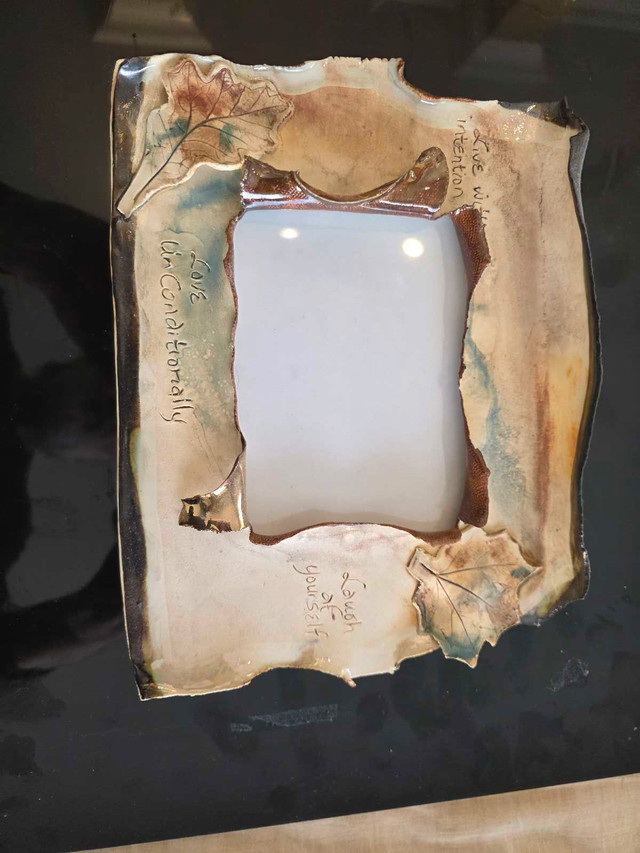 Adorn your cherished memories with this unique, hand-crafted ceramic frame featuring delicate leaf accents and inspirational inscriptions. This frame brings a touch of artistic warmth and a personal mantra to any space. Add a little zen to your space! If the ad is up, it's still available!