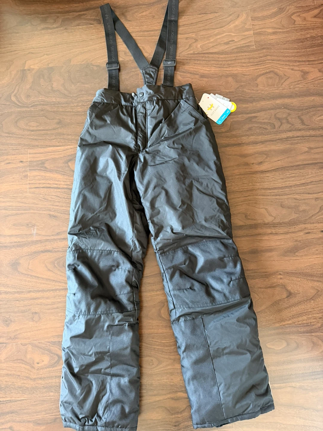 Brand new Hot Paws women ' snow pants, complete with tags! These black snow pants feature detachable suspenders, reinforced oxford knees, and are waterproof and windproof. They also have reflective details and gaiter cuffs with gripper elastic to keep the snow out. Perfect for keeping you warm and dry this winter!
