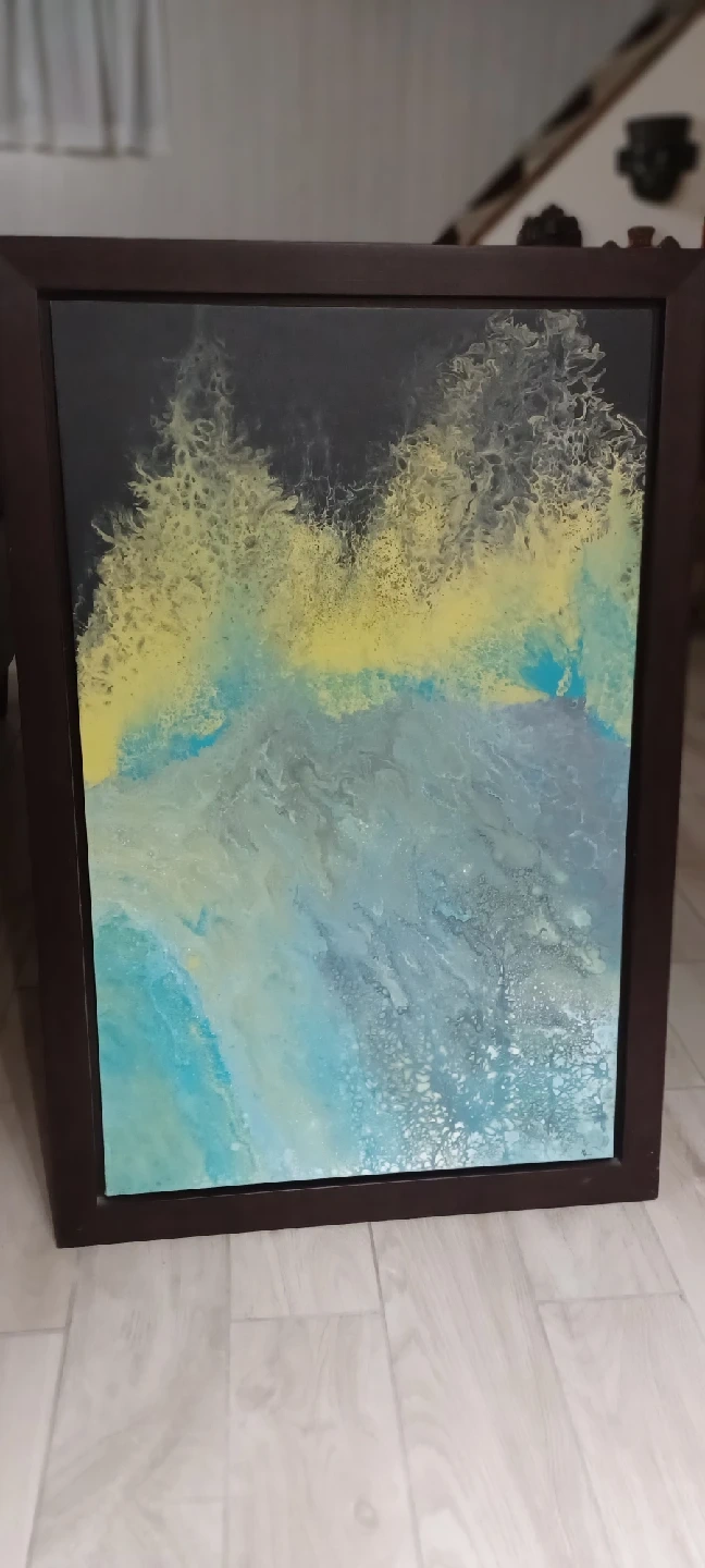 Selling a unique abstract painting with a dark wooden frame. The painting features a blend of soft colours, including peach, grey, and hints of blue. It would make a lovely addition to any room!
