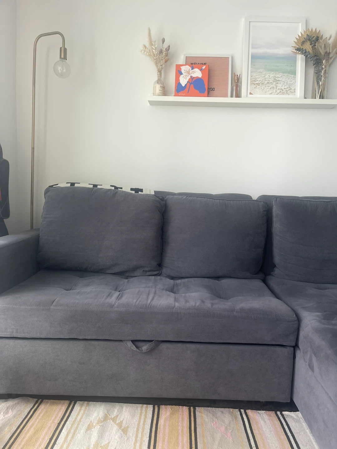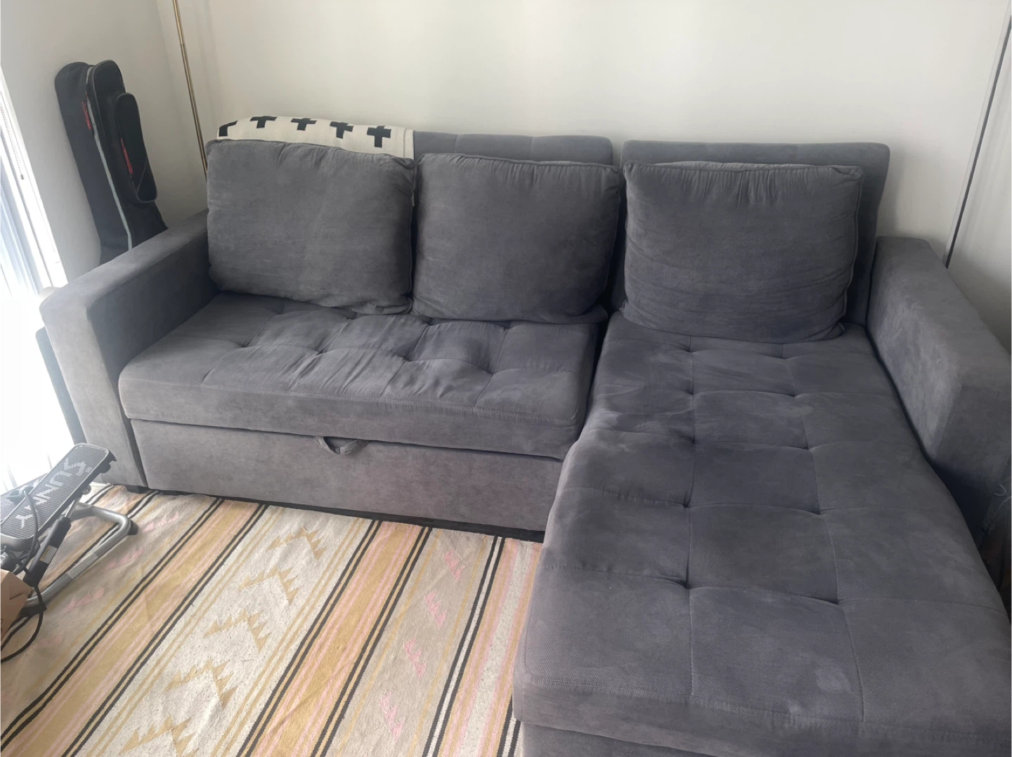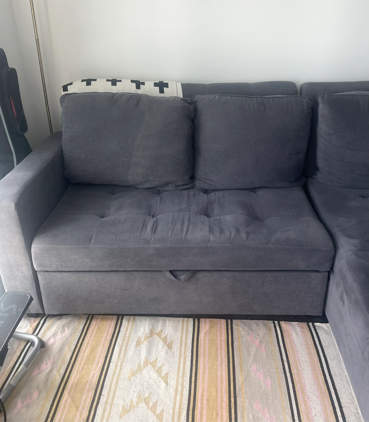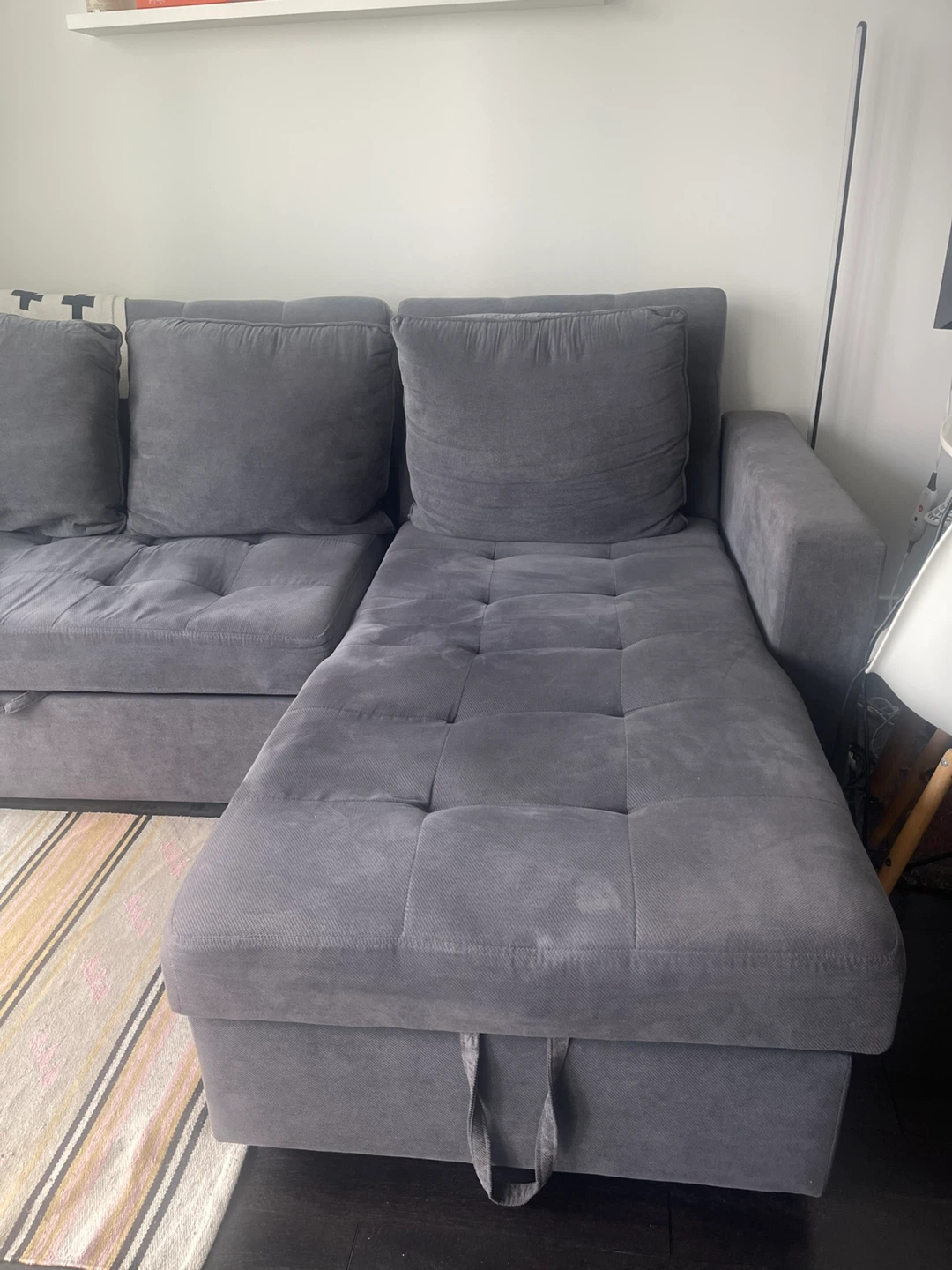 Selling a comfy grey sectional sofa originally from Structube! It's in good condition and features handy storage underneath the chaise and extendable seat for extra lounging or a sofa bed for guests. Perfect for a living room or den. Pet free and non smoking house.