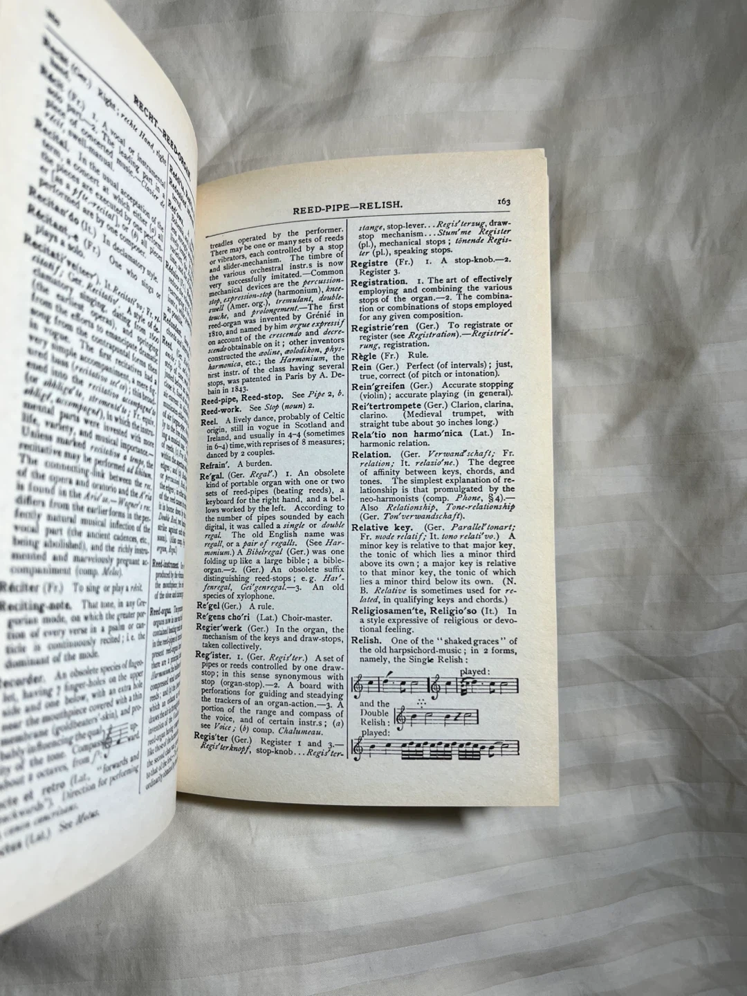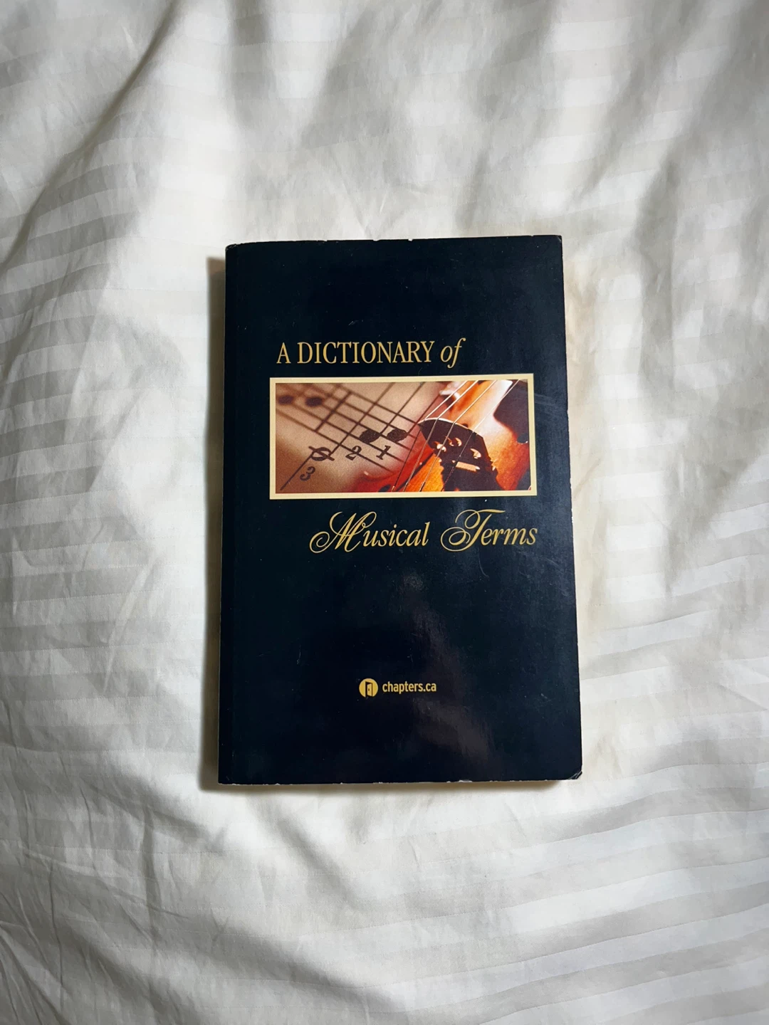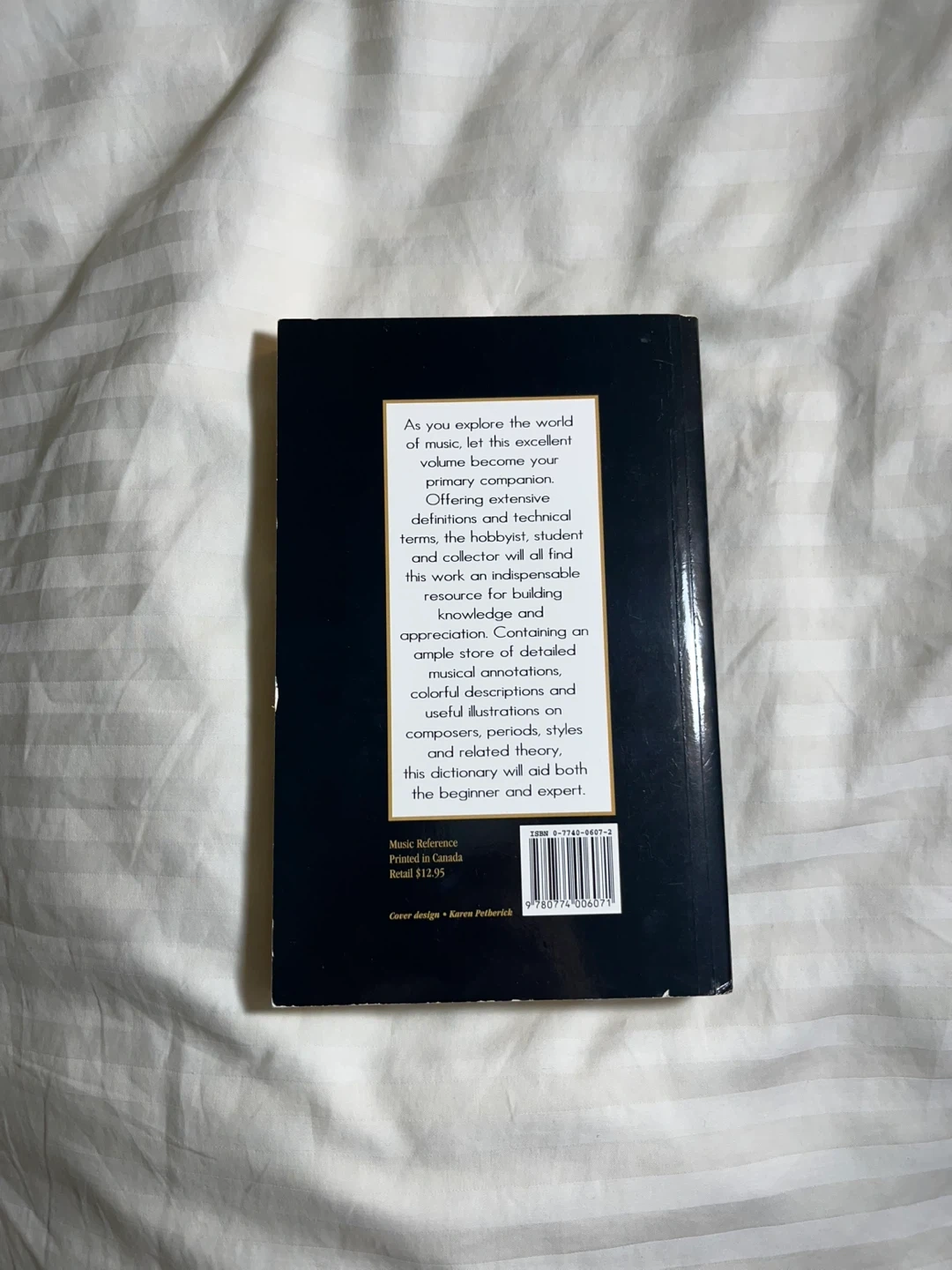 This is a dictionary containing an ample store of detailed musical annotations, colorful descriptions and useful illustrations, composers, periods, styles and related theory. It was printed in Canada and originally retailed for $12.95.