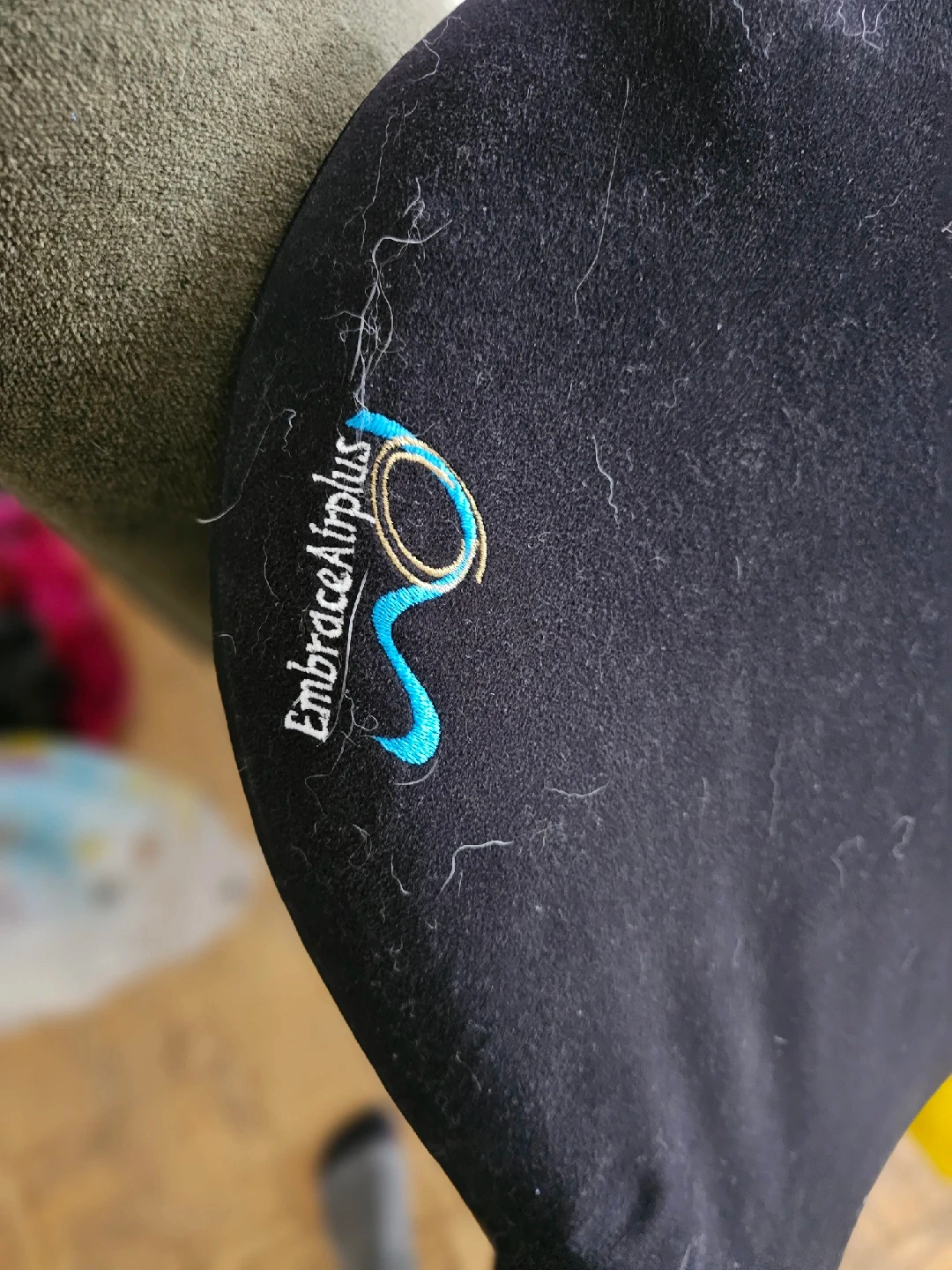 Here's a used EmbraceAirplus back support cushion! the air pump fell off but can be used with it. Perfect for providing extra support and comfort while sitting.