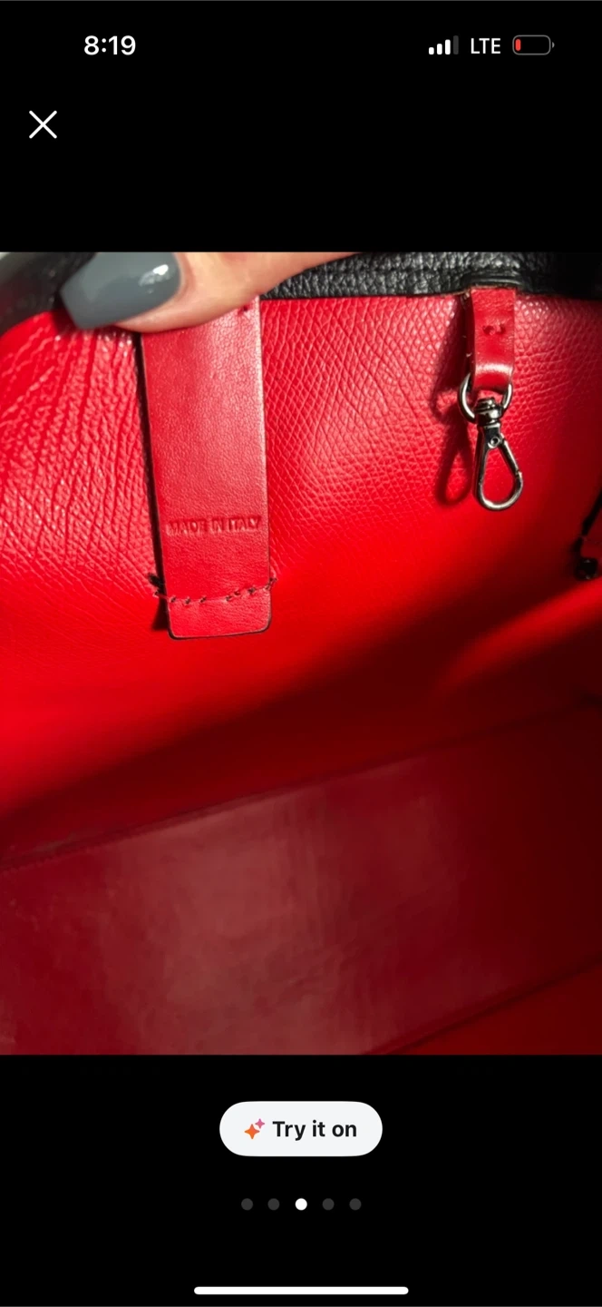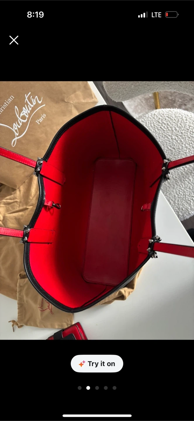 Selling a Christian Louboutin - calfskin leather spike Cabata tote with removable pouch. It's made of black leather with red interior. The bag is in great condition and comes with its original dust bag!