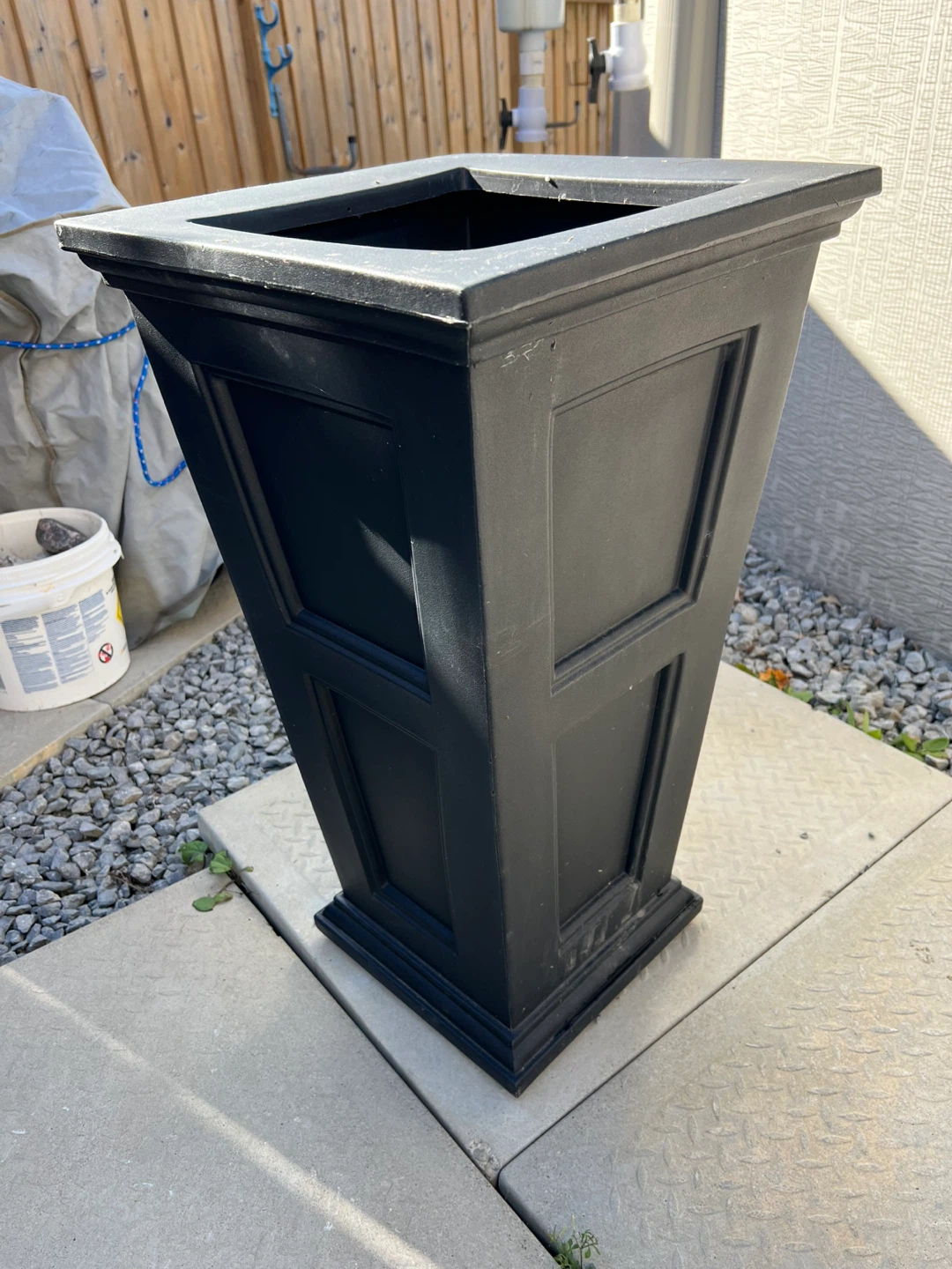 I'm selling a black outdoor planter. It's in great shape and ready to add some style to your garden or patio!