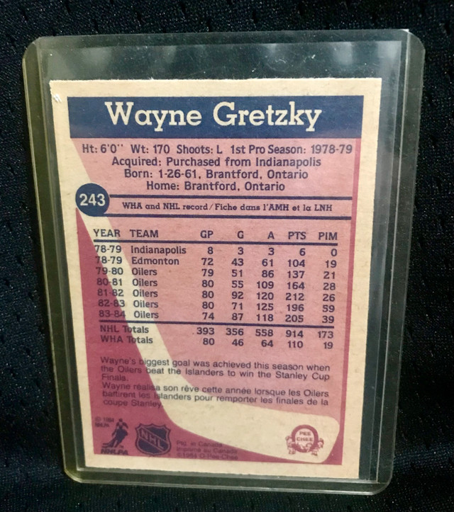 I'm offering a 1984-85 O-Pee-Chee Wayne Gretzky #243 hockey card. This card features Wayne Gretzky of the Edmonton Oilers.