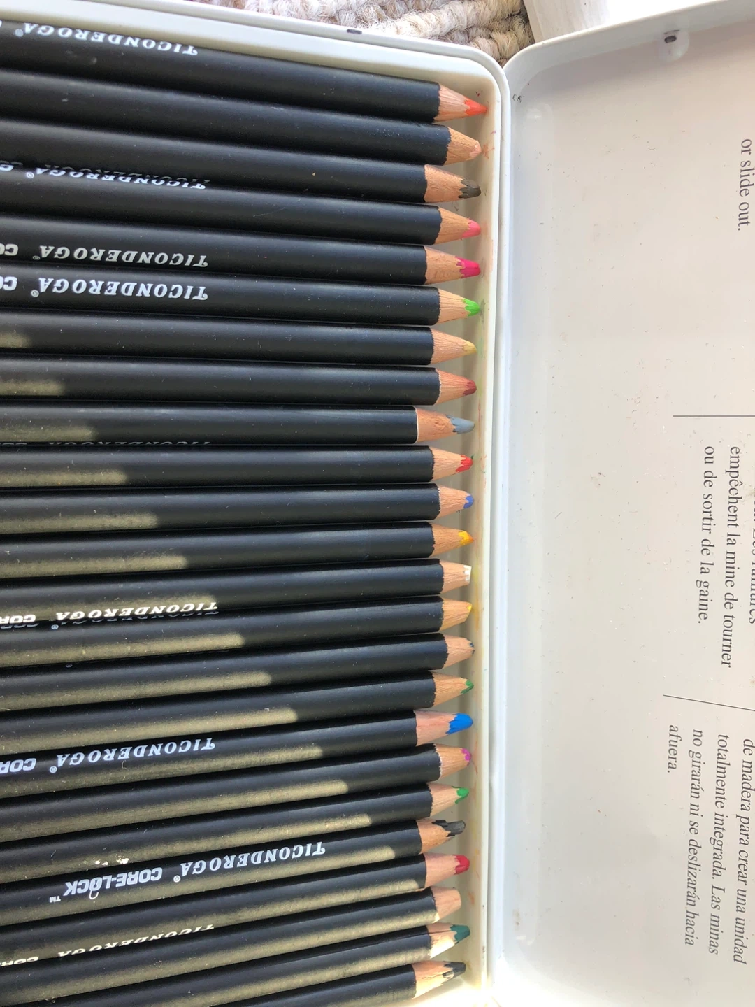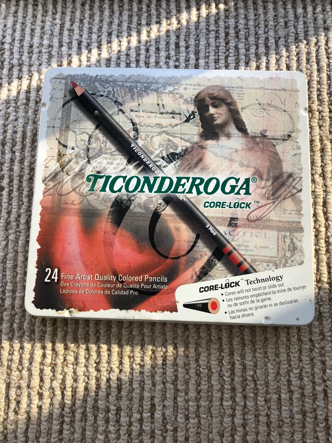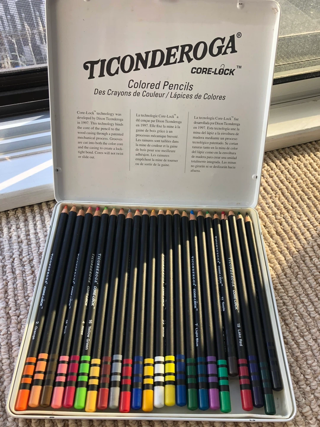 413Selling a set of Ticonderoga Core-Lock colored pencils. This is a set of 24 fine artist quality colored pencils. The Core-Lock technology ensures the cores won't twist or slide out. Perfect for artists of all levels!