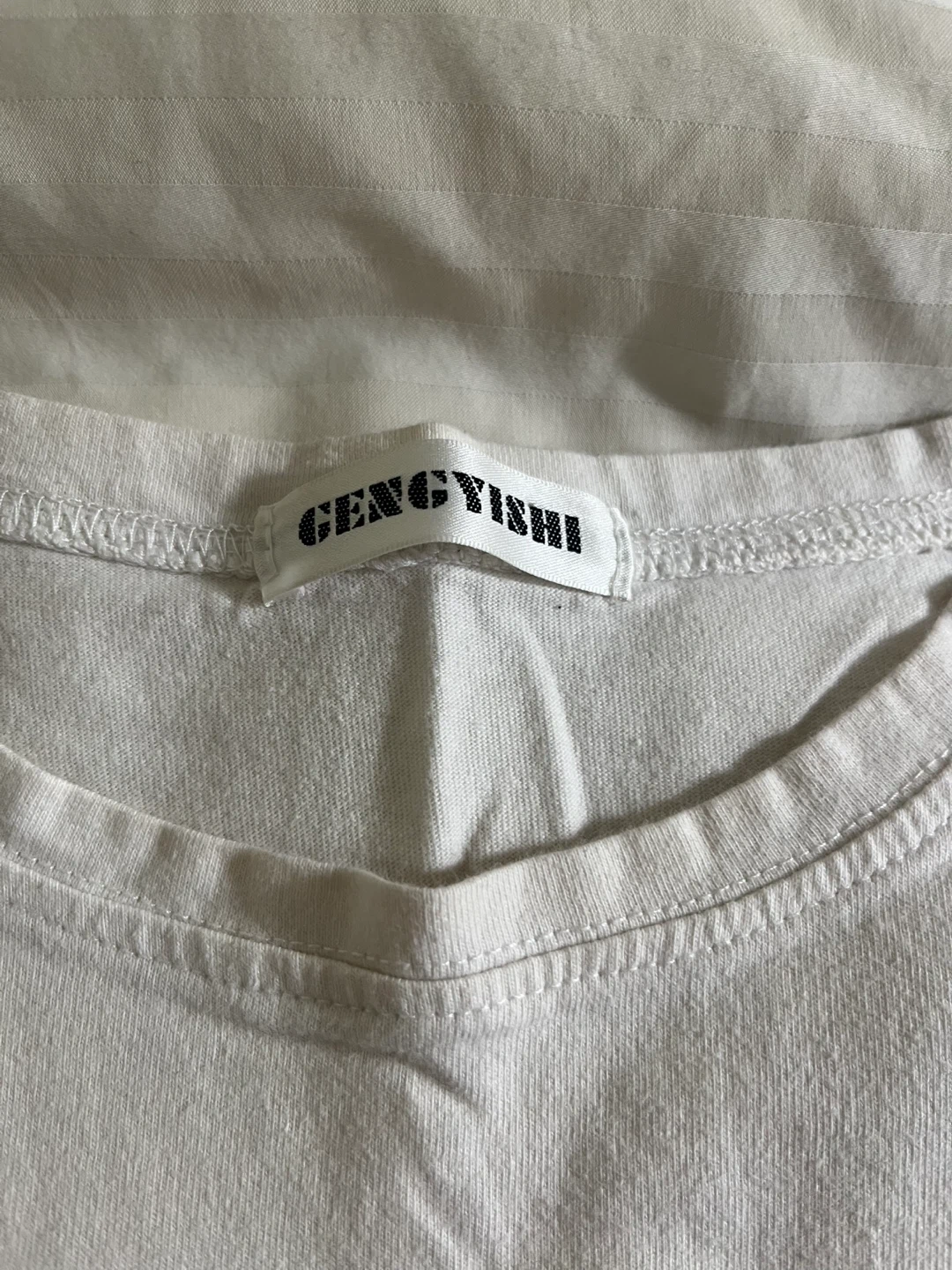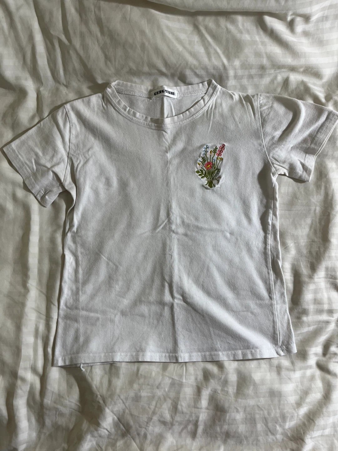 A cute and simple white T-shirt from Gencyish! It features a lovely floral embroidery design on the front. Perfect for adding a touch of charm to your everyday outfits.
