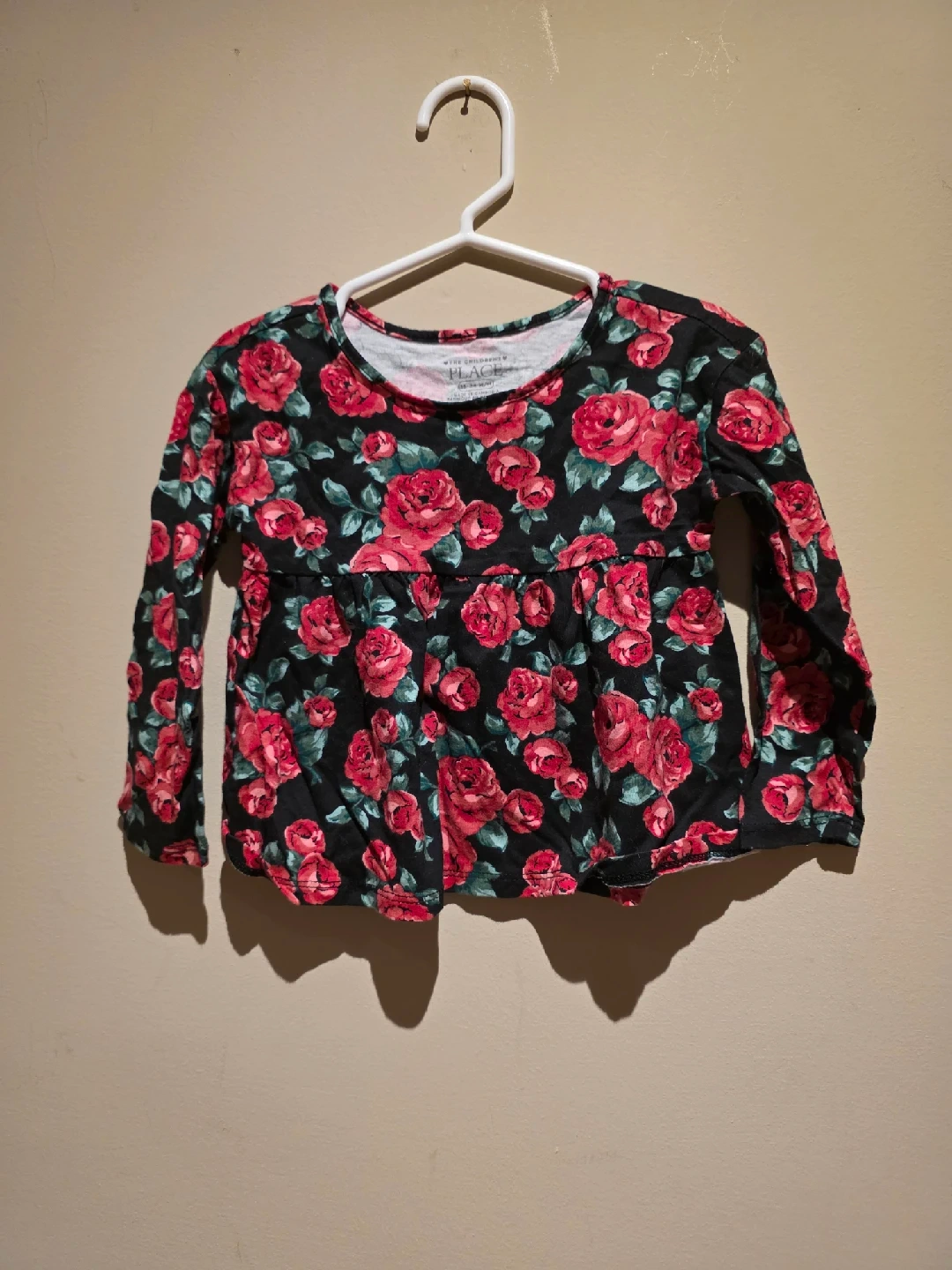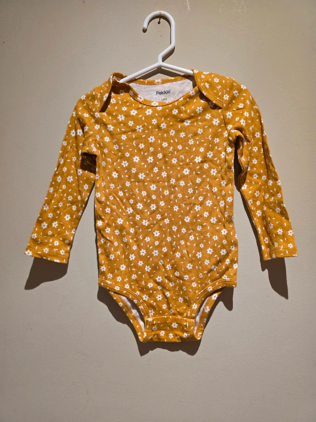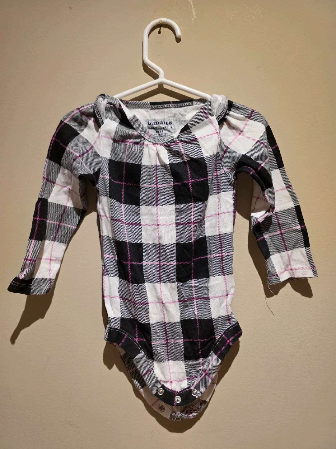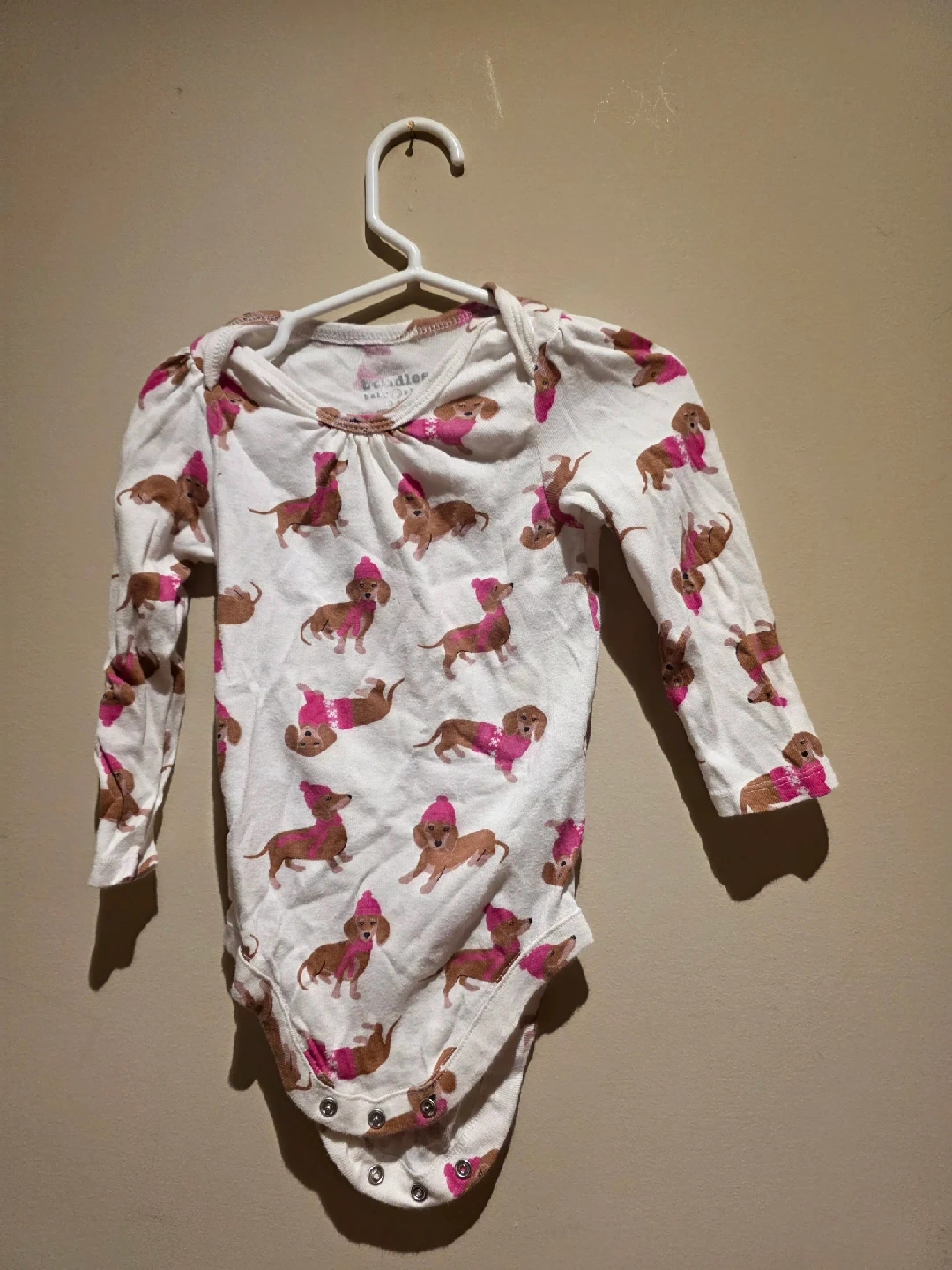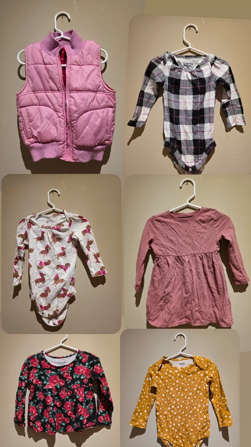 66Selling a mixed bundle of baby clothes. Includes a pink vest, a black and white plaid onesie, a white onesie with dogs, a pink dress, a black and red floral shirt, and a yellow floral onesie. All are in good condition!