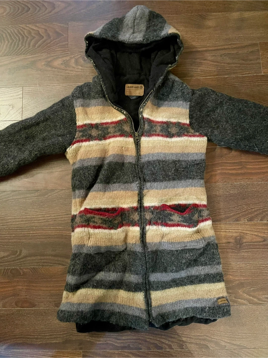 Cozy up in this Laundromat hooded jacket! It's a size large and features a unique striped pattern in earth tones. Perfect for adding a touch of warmth and style to your wardrobe