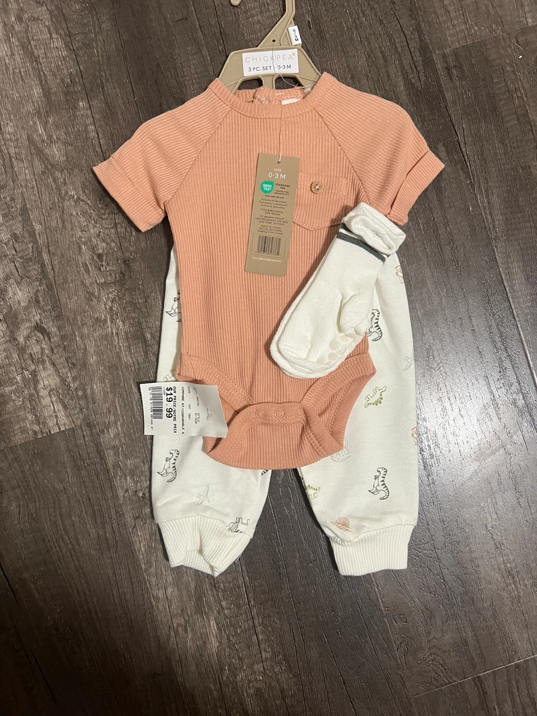 37Brand new Chickpea 3-piece baby set, perfect for your little one! This set includes a cute bodysuit, pants, and socks, all in size 0-3 months. The original price was $19.99.
