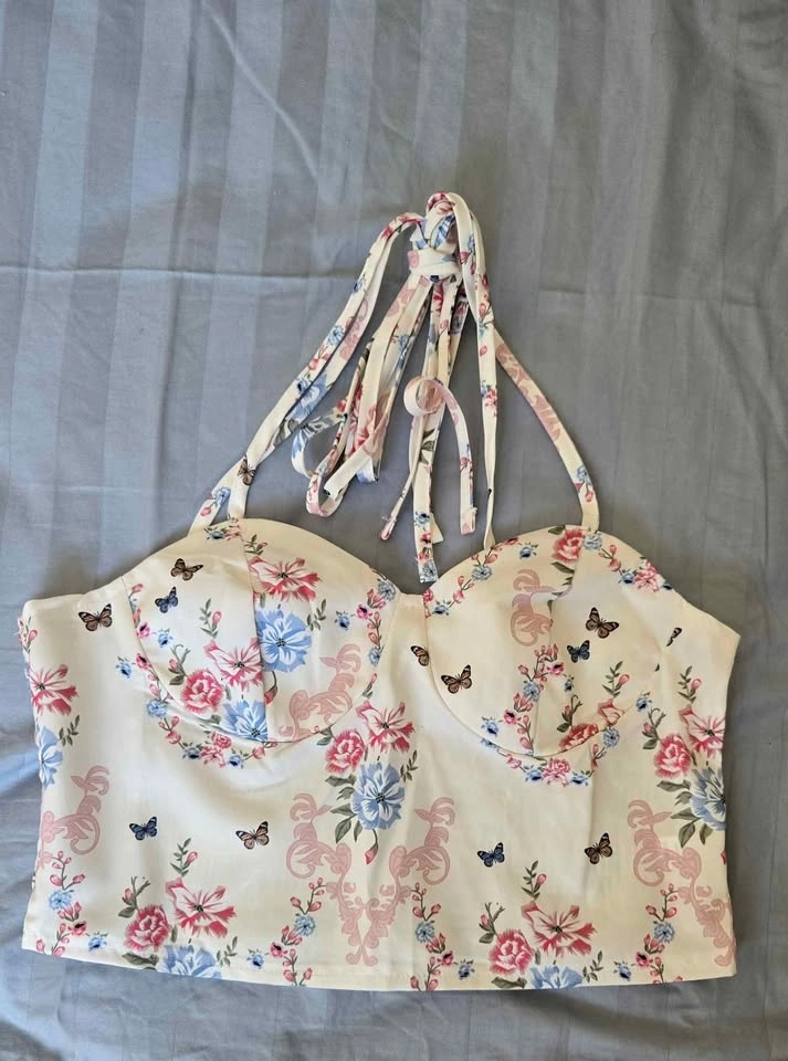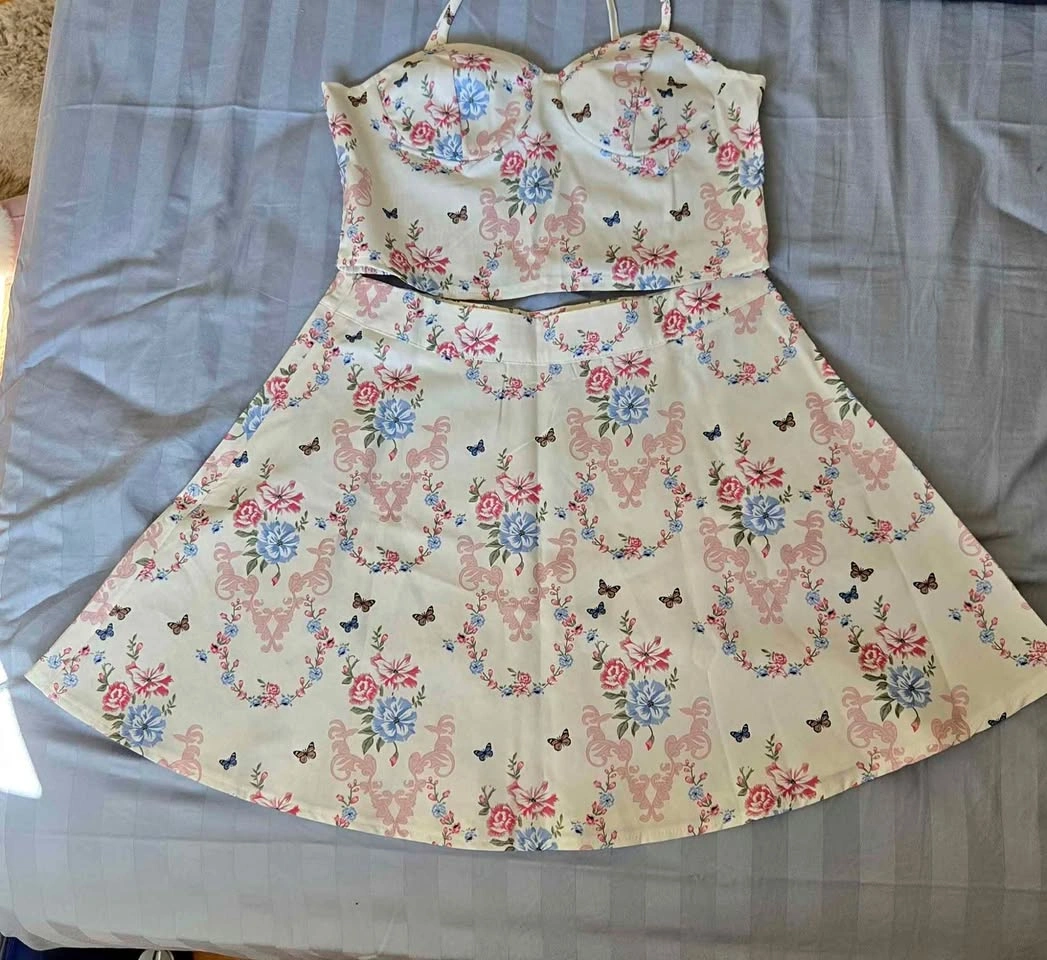 Floral two-piece set in Small size – includes a crop top with adjustable straps and matching A-line skirt. Light, comfy, and perfect for summer outings! 🌸✨ (Never worn as it didn't match my size)