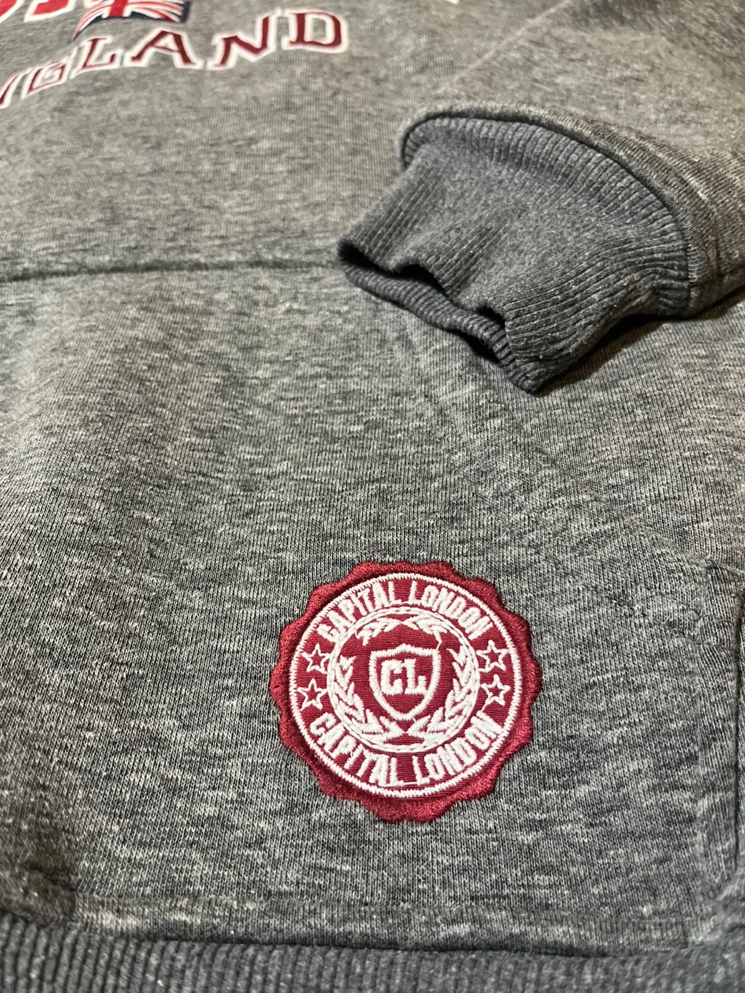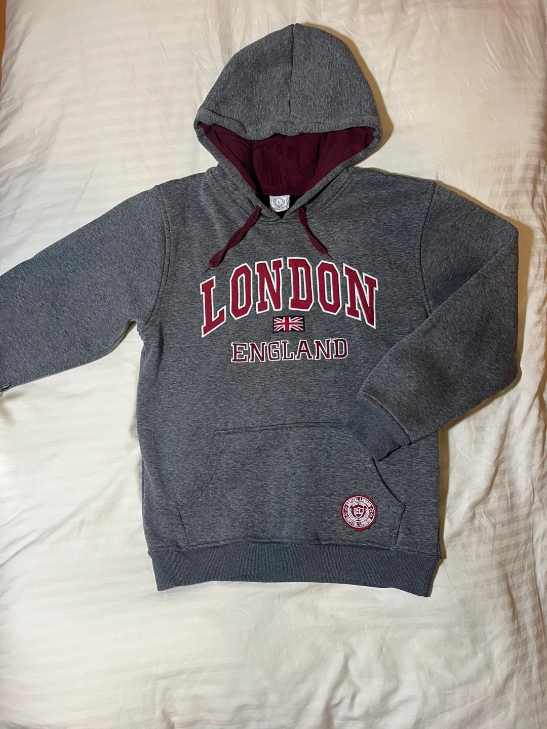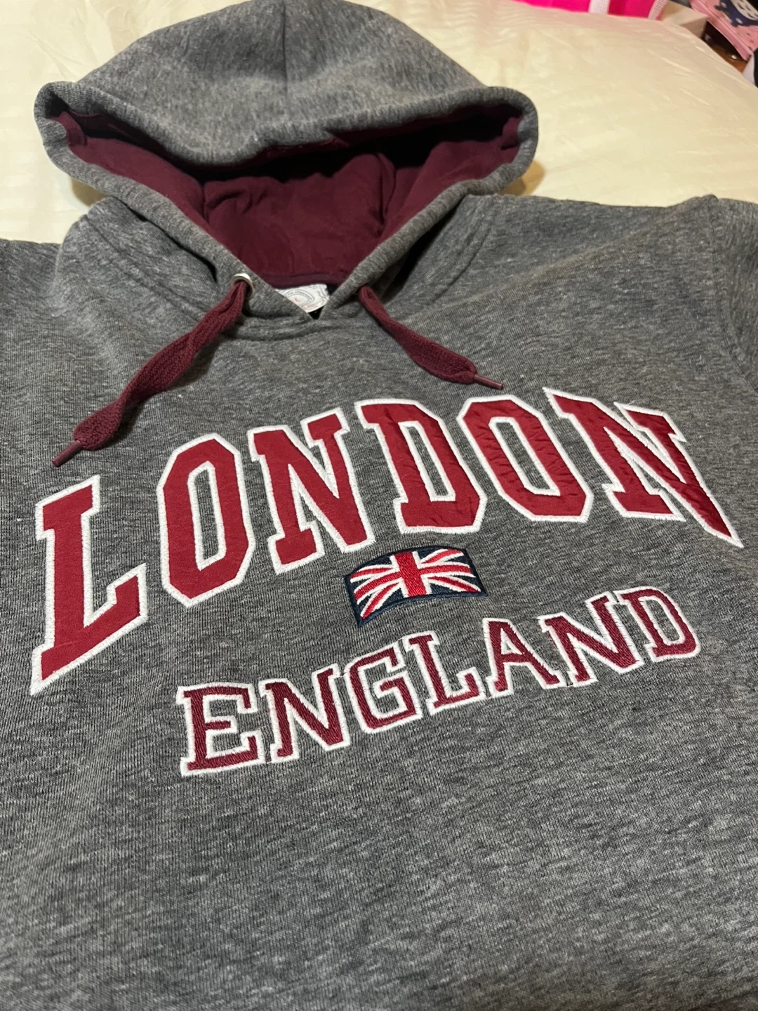 Stay cozy and stylish with this gray hoodie featuring 'London England' print. Perfect for casual outings.
